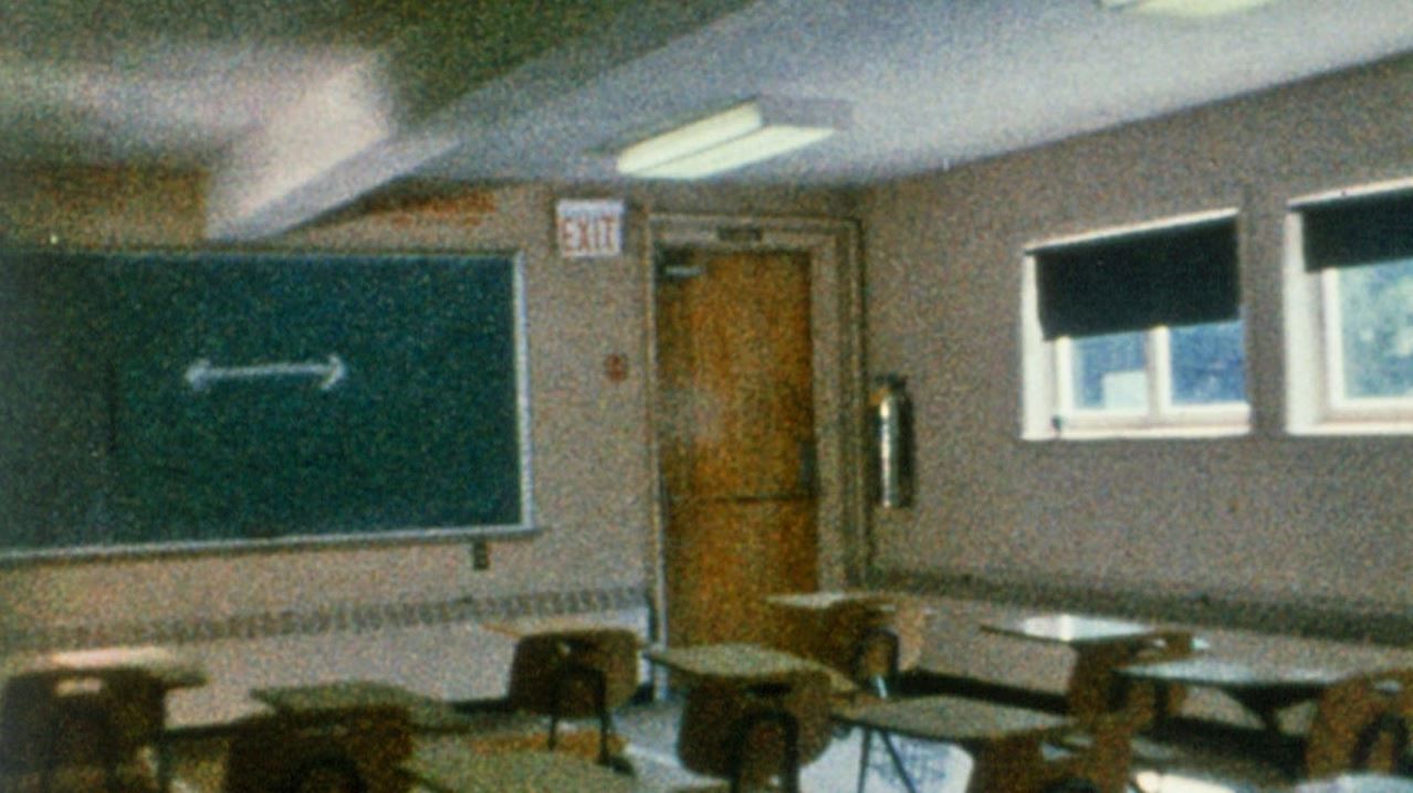 A dizzying exploration of perception and the possibilities of cinema. In a nondescript classroom a static camera swivels back and forth, back and forth panning across the room. Speeding up and slowing down this back and forth arc, the empty classroom appears at times blurry, sometimes populated with one or more people moving through the frame unconcerned with the camera. This repetition attunes the viewer to the variances in the image and the feeling of motion, turning a cinematic work into something akin to sculpture.