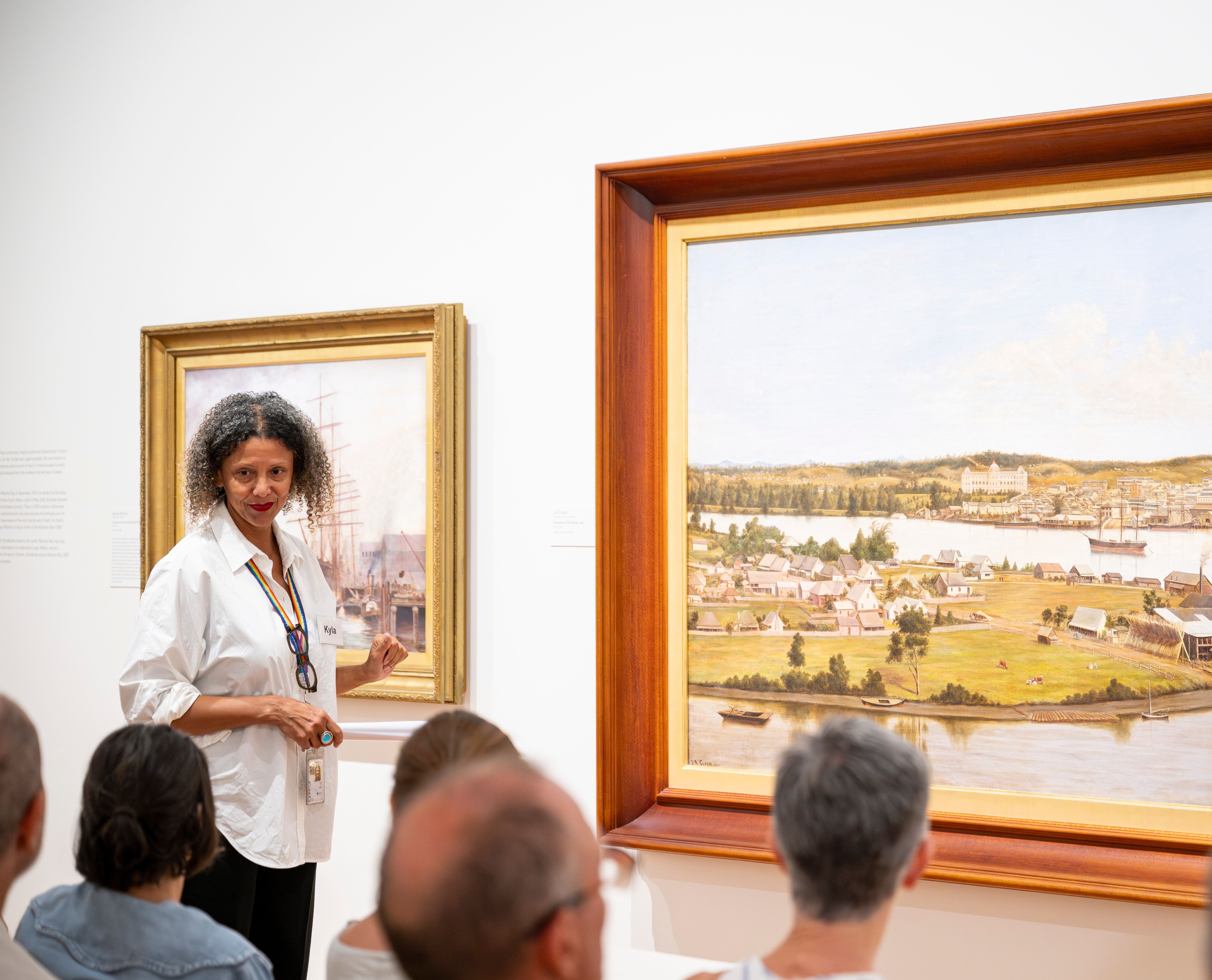 Art and Dementia program participants engage in guided slow-viewing of Joseph Augustus Clarke, Australia 1840–1890 / Panorama of Brisbane 1880 / Oil on canvas / 137 x 366cm / Collection: Queensland Museum / Photograph: C Callistemon / © QAGOMA / View full image