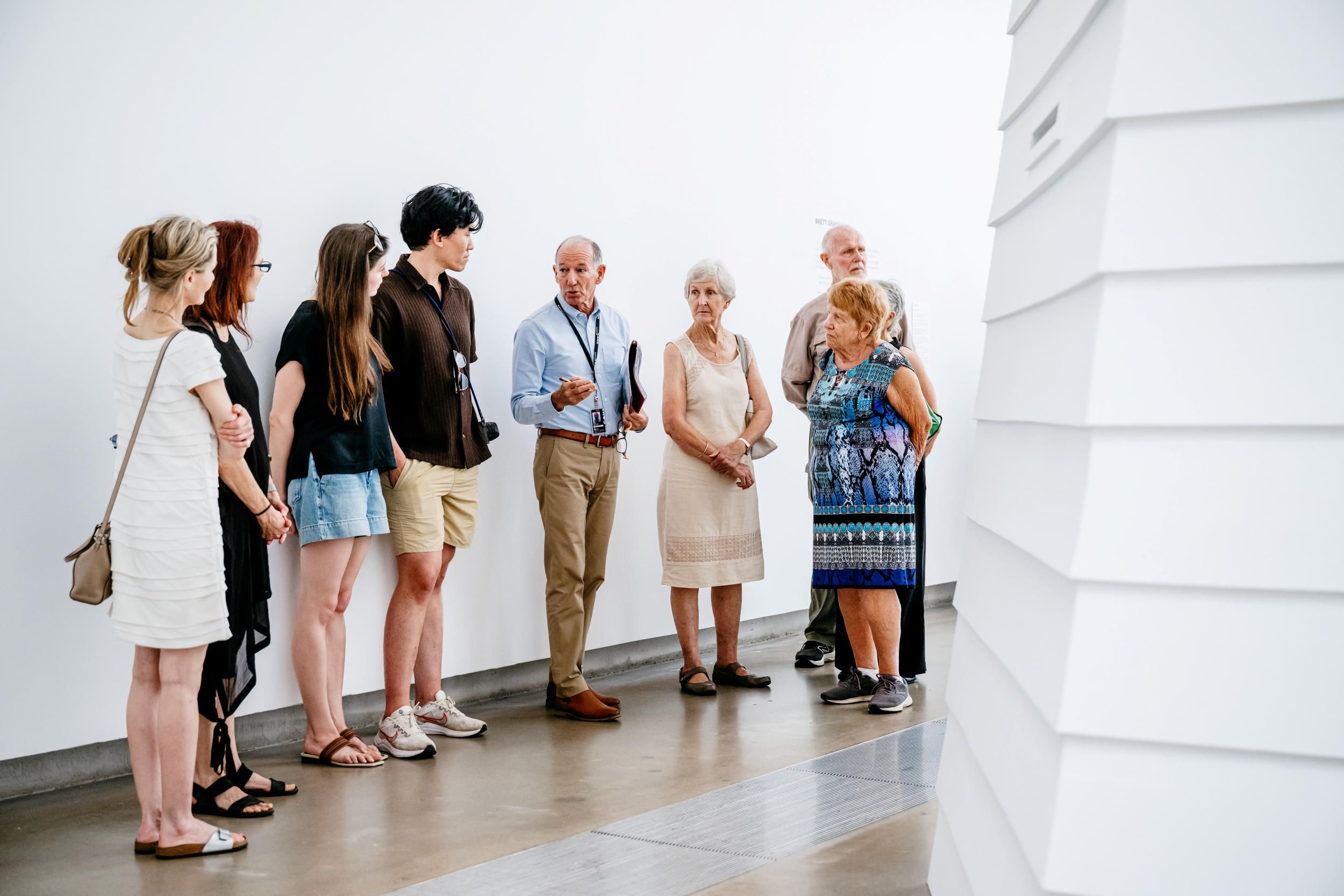 A Volunteer Guide engages visitors on a tour at the Gallery of Modern Art (GOMA). Photography by Joe Ruckli | QAGOMA / View full image