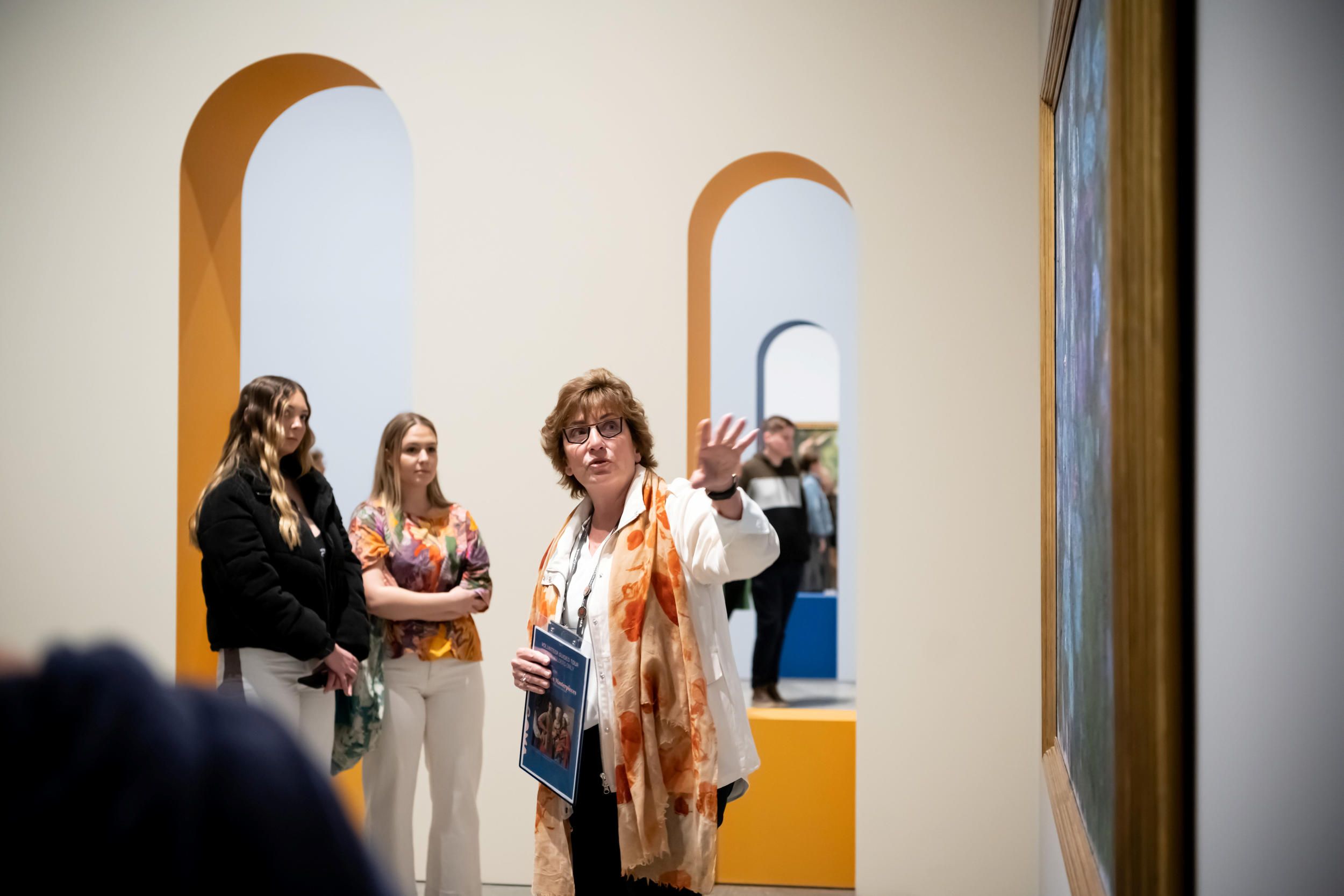 A Volunteer Guide engages visitors on a tour at the Queensland Art Gallery. Photography by Chloe Callistemon | QAGOMA / View full image
