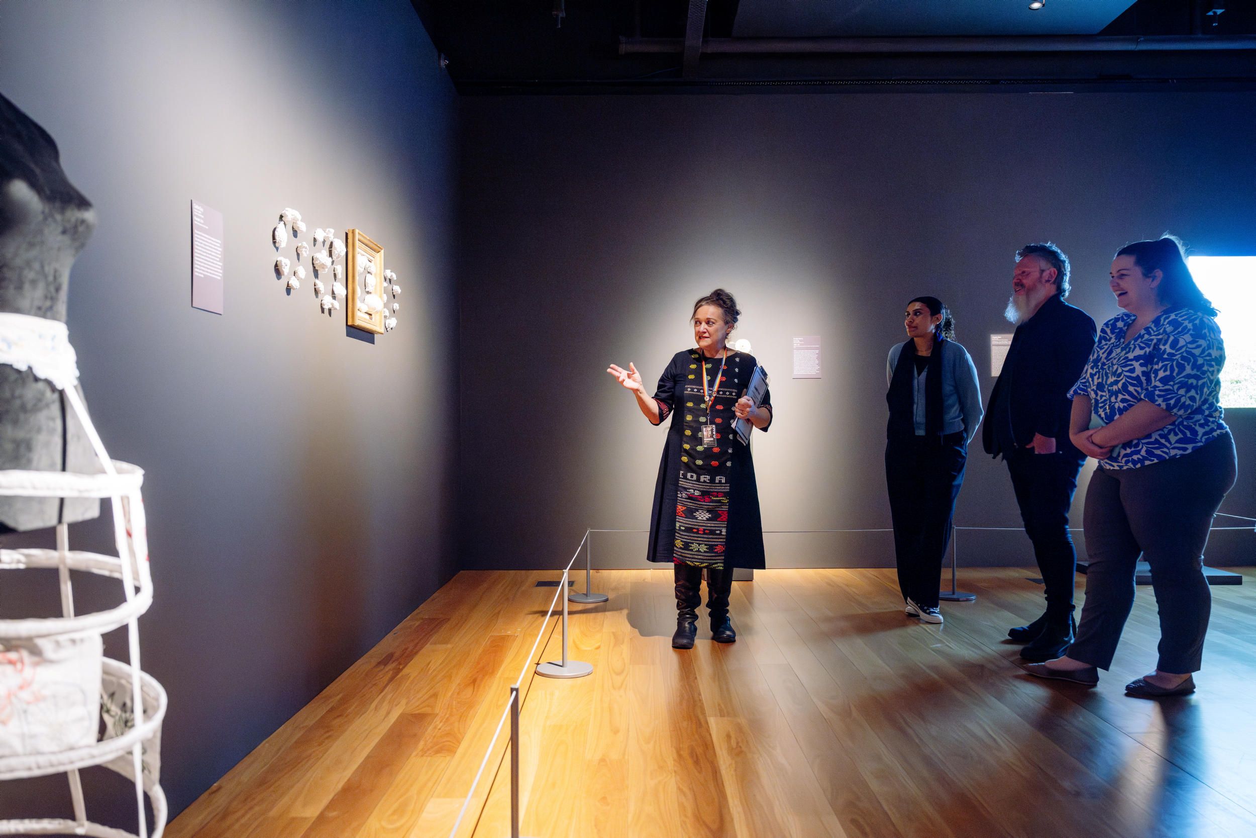 A Volunteer Guide engages visitors on a tour at the Queensland Art Gallery. Photography by Joe Ruckli | QAGOMA / View full image