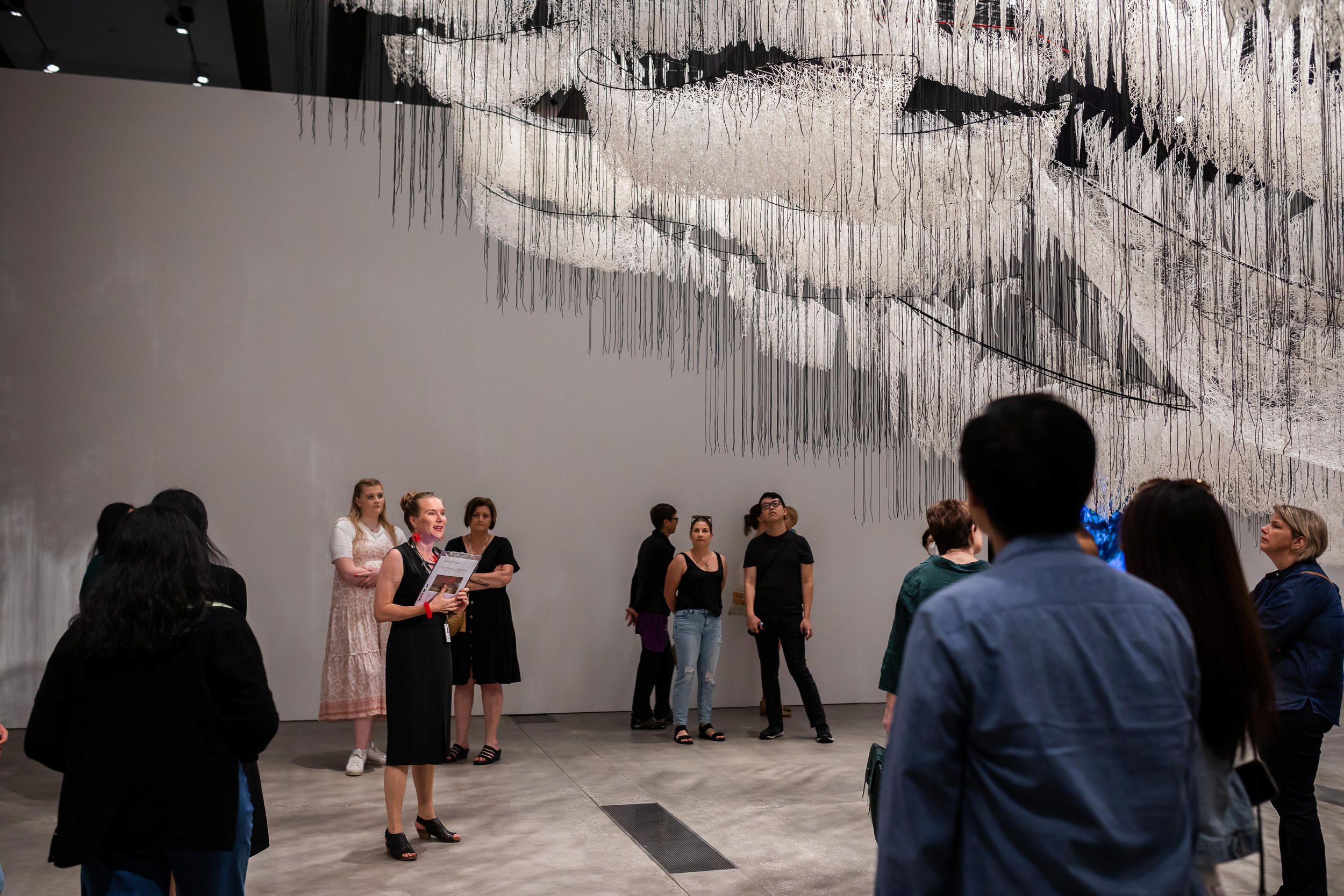 A Volunteer Guide engages visitors on a tour at the Gallery Of Modern Art. Photography by Katie Bennett | QAGOMA / View full image