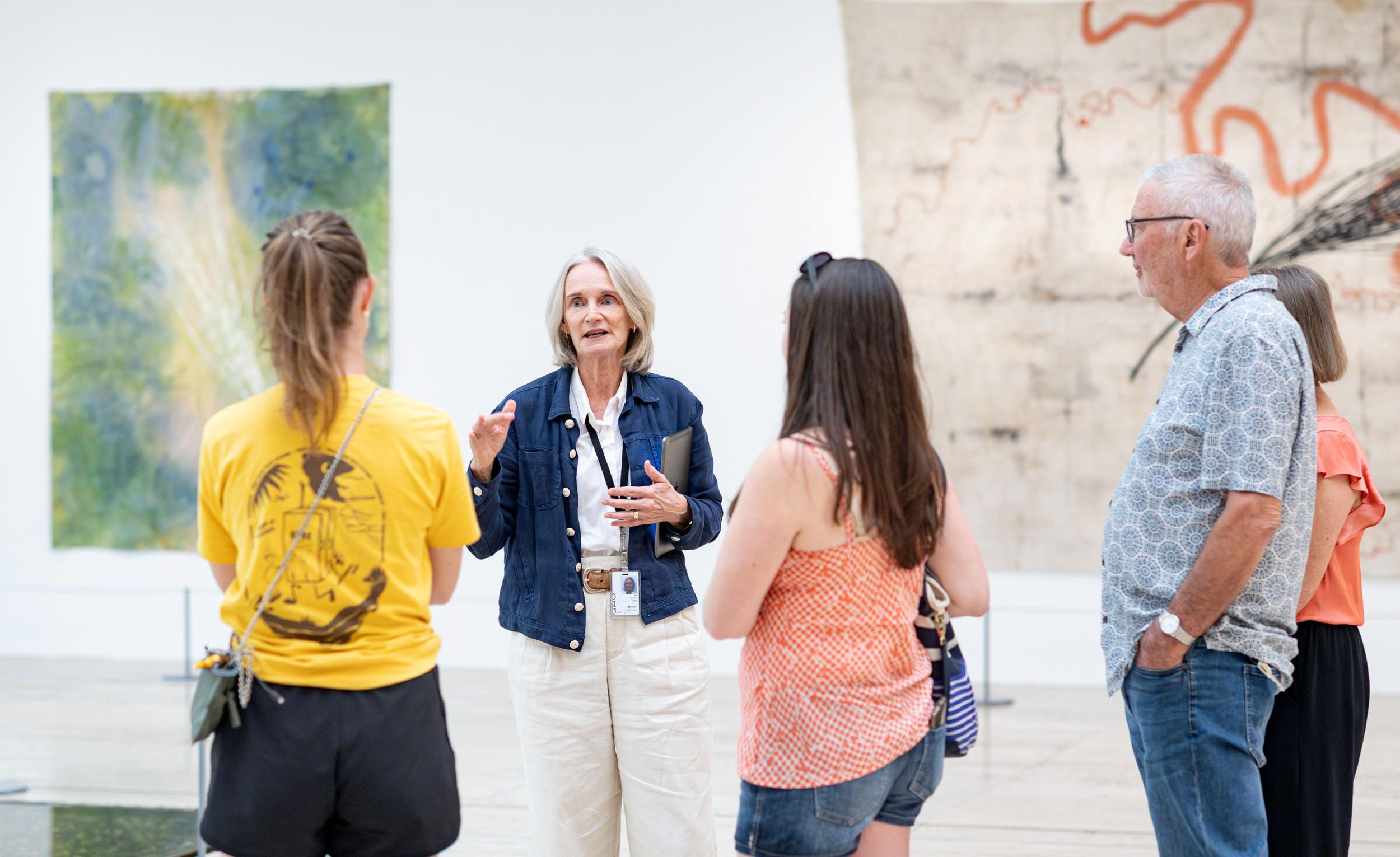 A Volunteer Guide engages visitors on a tour at the Queensland Art Gallery. Photography by Chloe callistemon | QAGOMA / View full image