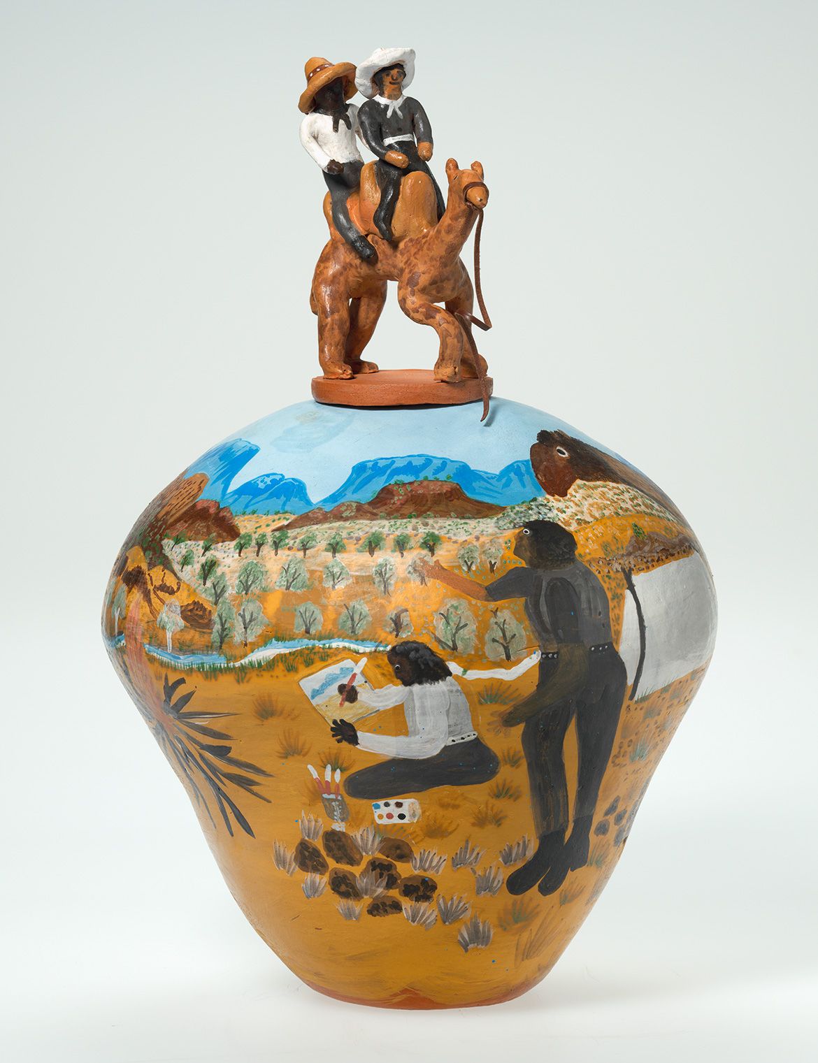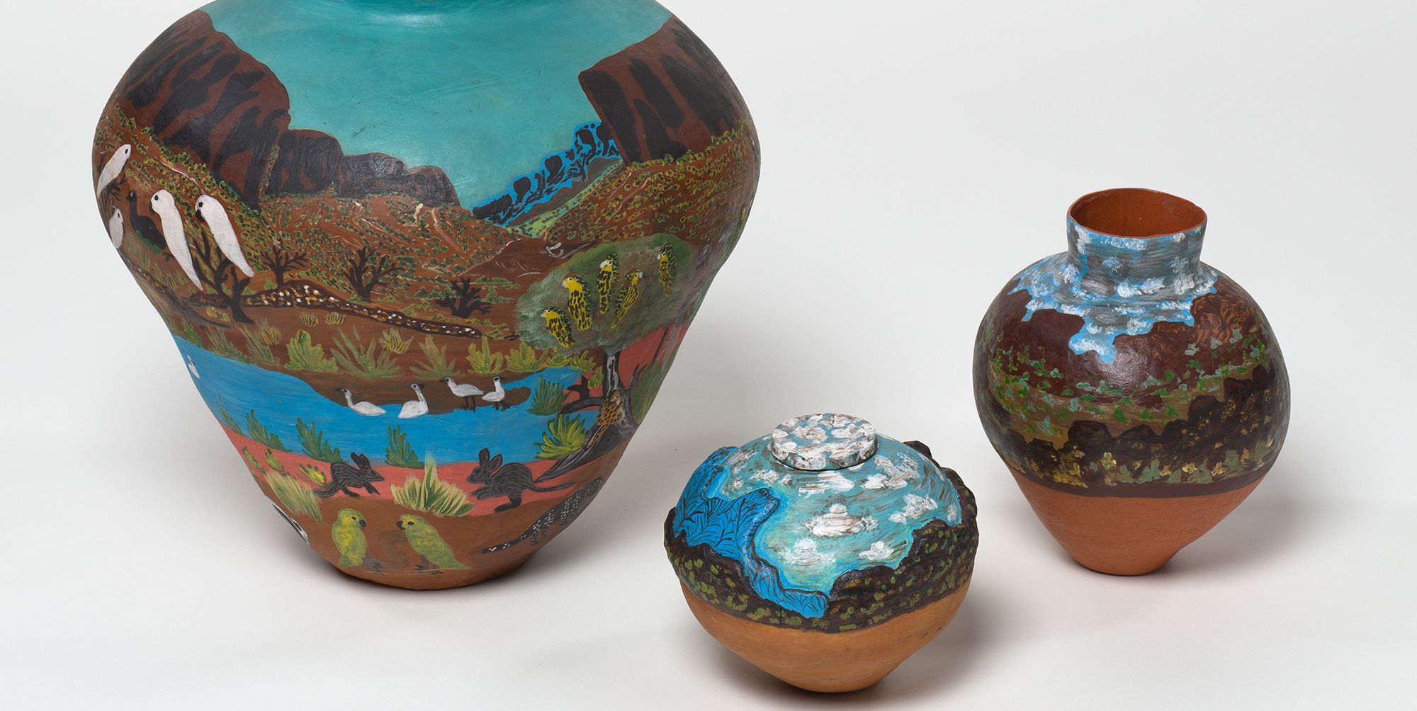 (l-r) Hermannsburg Potters, Northern Territory, Australia est. 1990 / Irene Mbitjana Entata, Arrernte/Luritja people, Australia 1946–2014 / Pmere (My country) 1996 / Earthenware, hand-built terracotta clay with underglaze colours and synthetic polymer paint / 42 x 44cm (diam.) / Purchased 1996. QAG Foundation / © Irene Mbitjana Entata / Noreen Ngala Hudson, Arrernte people, Australia b.1947 / Pot: Pmere Nuka (My country) 1994 / Earthenware, hand-built terracotta clay with underglaze colours and applied decoration / pot: 16 x 20cm (diam.); lid:1.7 x 6.4cm (diam.) / Pot: Pmere Nuka (My country) 1994 / Earthenware, hand-built terracotta clay with underglaze colours / 28 x 17cm (diam.) / Purchased 1995. QAG Foundation / Collection: Queensland Art Gallery | Gallery of Modern Art / © Noreen Ngala Hudson/Copyright Agency / View full image
