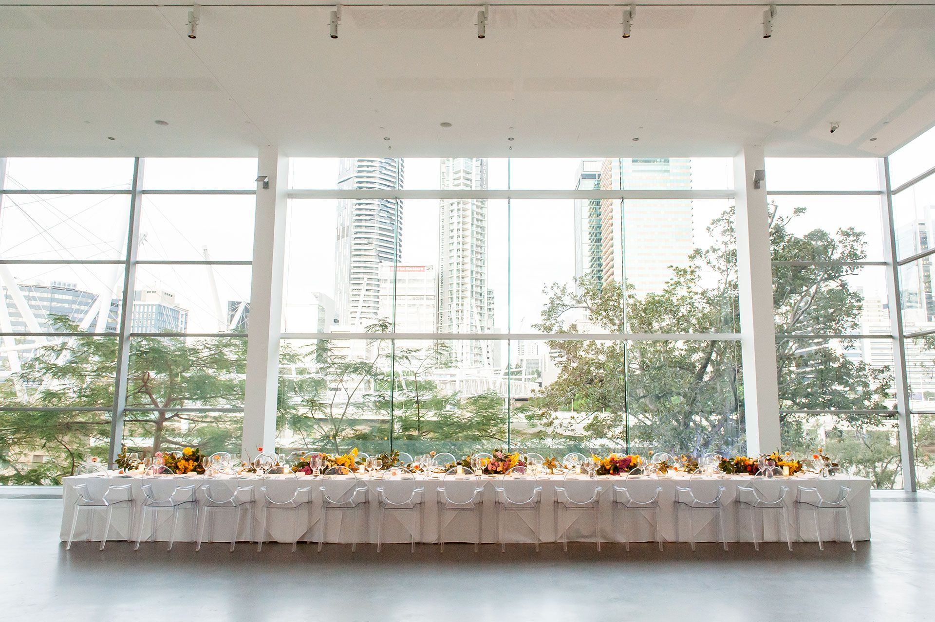 The Long Gallery is a unique and versatile event space with its towering ceiling and impressive display of contemporary art. The Sue and Brian King River Room, situated at the end of the Long Gallery, features floor to ceiling glass windows which provide striking river views.