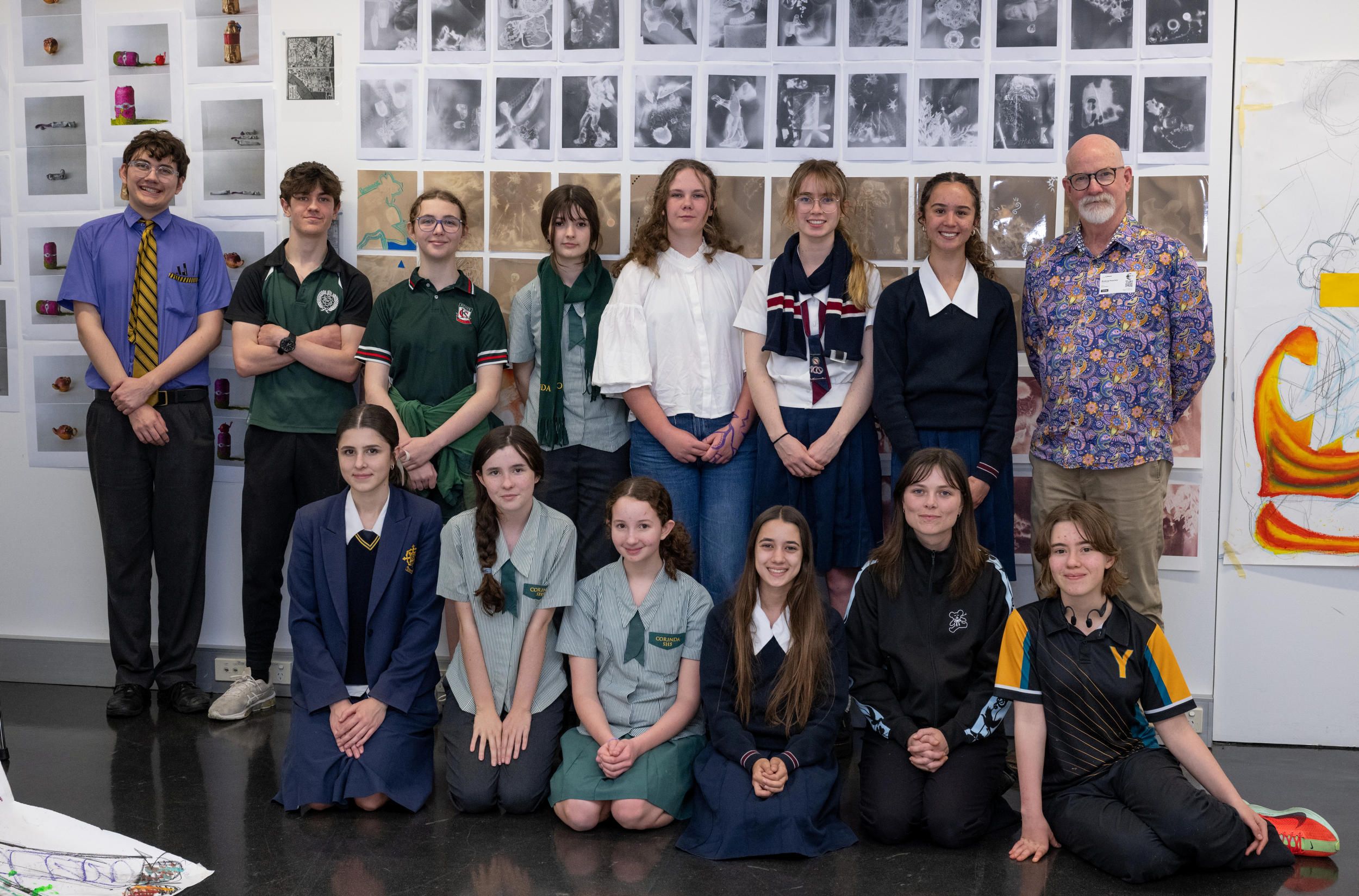 Art Academy participants with facilitators Andrew Peachey and Rachael Ryan (Program Officer, Education and Curriculum) / Photograph: N Umek © QAGOMA / View full image
