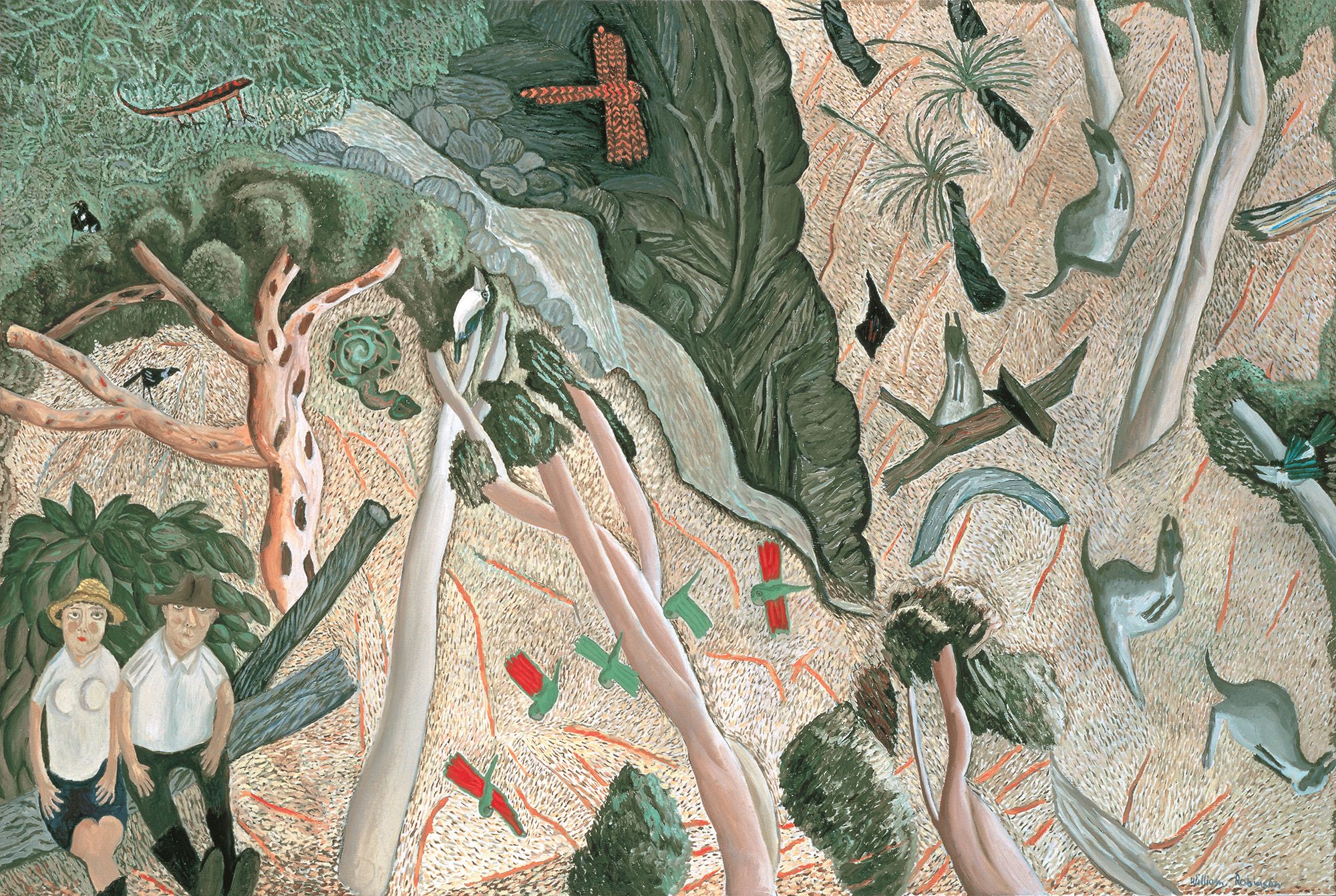 William Robinson, Australia 1936–2025 / William and Shirley, flora and fauna 1985 / Oil on canvas / 126 x 187cm / Purchased 1985 / Collection: Queensland Art Gallery | Gallery of Modern Art / © QAGOMA / View full image