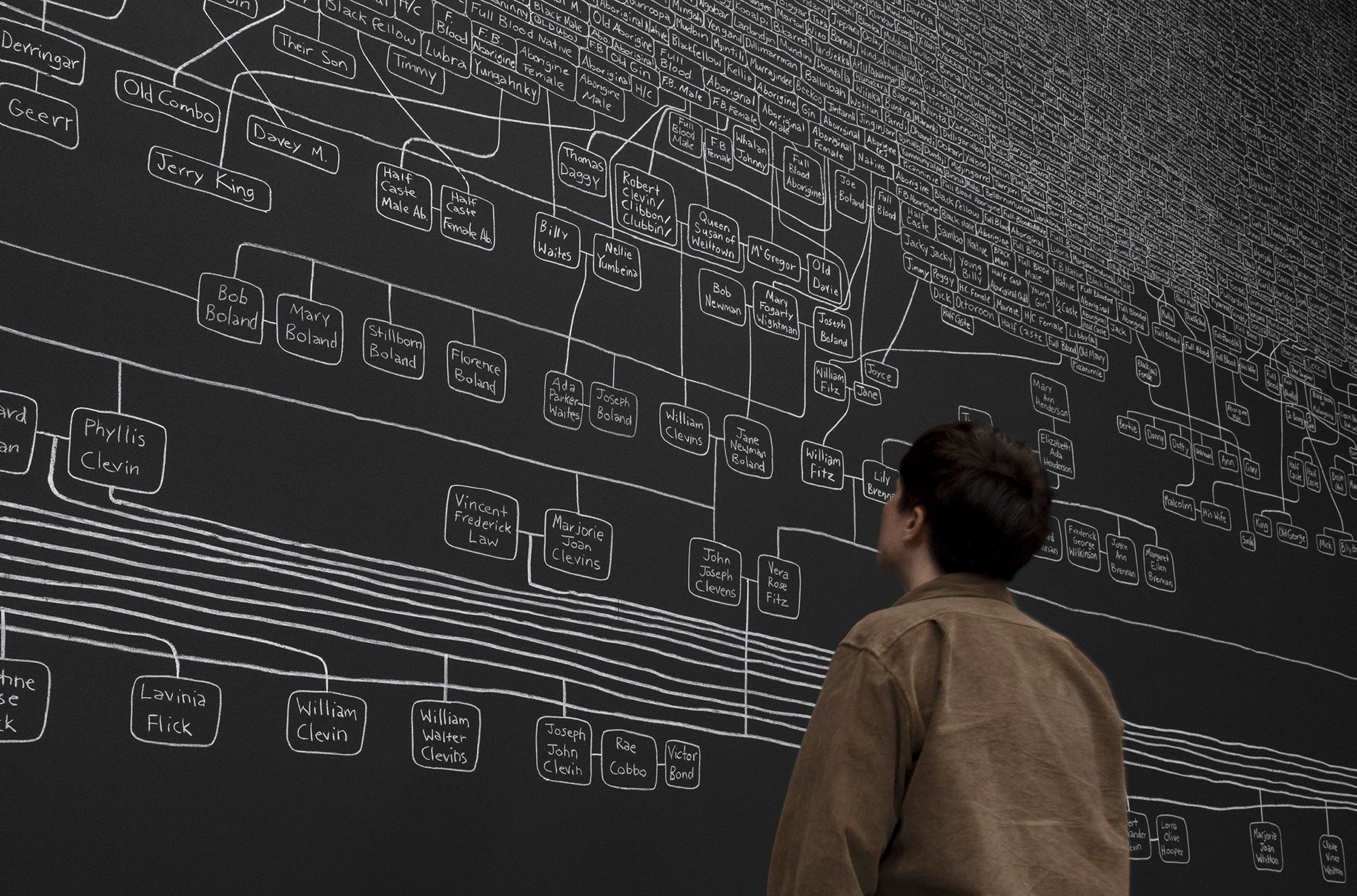 The remarkable and deeply affecting kith and kin comprises a vast genealogical chart capturing Moore’s First Nations Australian and convict British and Scottish connections spanning more than 2400 generations over 65,000 years — an extraordinary image of human connection through deep time.