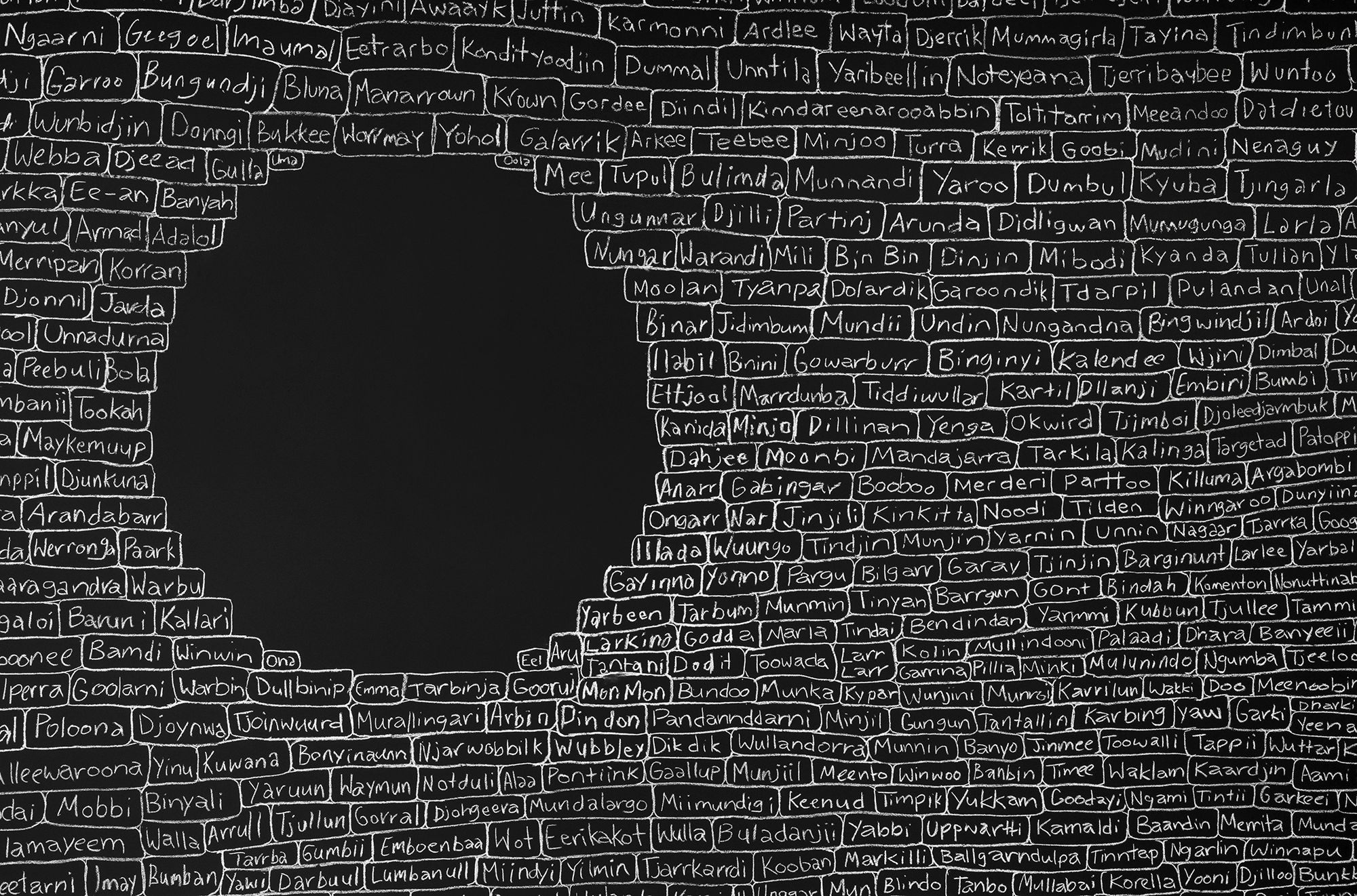 Over several weeks, the artist and a team of installers have meticulously hand-drawn this ancestral map in chalk across a large expanse of four walls in a stand-alone room specially built to replicate the internal dimensions of the Australia Pavilion in Venice.