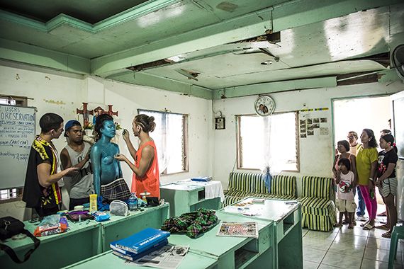 The first of these portraits features performance collaborator and friend Jai Jai, who is from Tacloban, where the recent typhoon hit. In Balud, her portrait, she is singing a song of resistance. She transforms into a glammananangaal, a girl from the provinces who covers herself in coconut oil in the evening, detaches the top half of her body from the bottom, and grows wings. Some of the mananangaal’s stories are malevolent, but in these portraits the artists seek to transform demonisation into positive resistance and transgression.