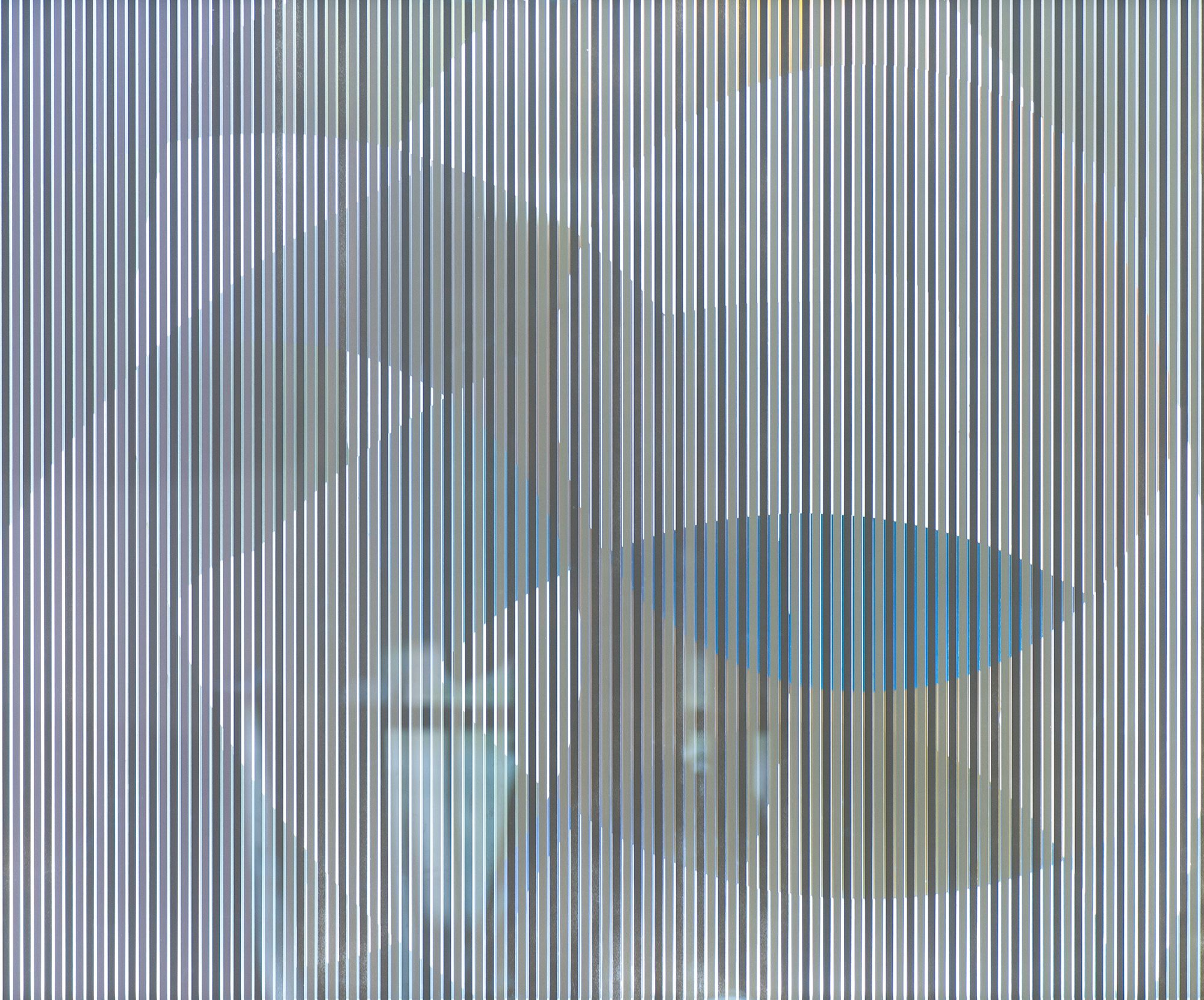 Out of sight uses lenticular techniques to animate the work as viewers move around it, revealing a ‘hidden’ sequence of six images. The title of the artwork refers to the fact that, at any one time, most of the images are literally ‘out of sight’, masked by the striped pattern of the front panel. The title also references the 1964 song of the same name by James Brown (one of Austin’s favourite recording artists), who was known for playing with language in his lyrics.