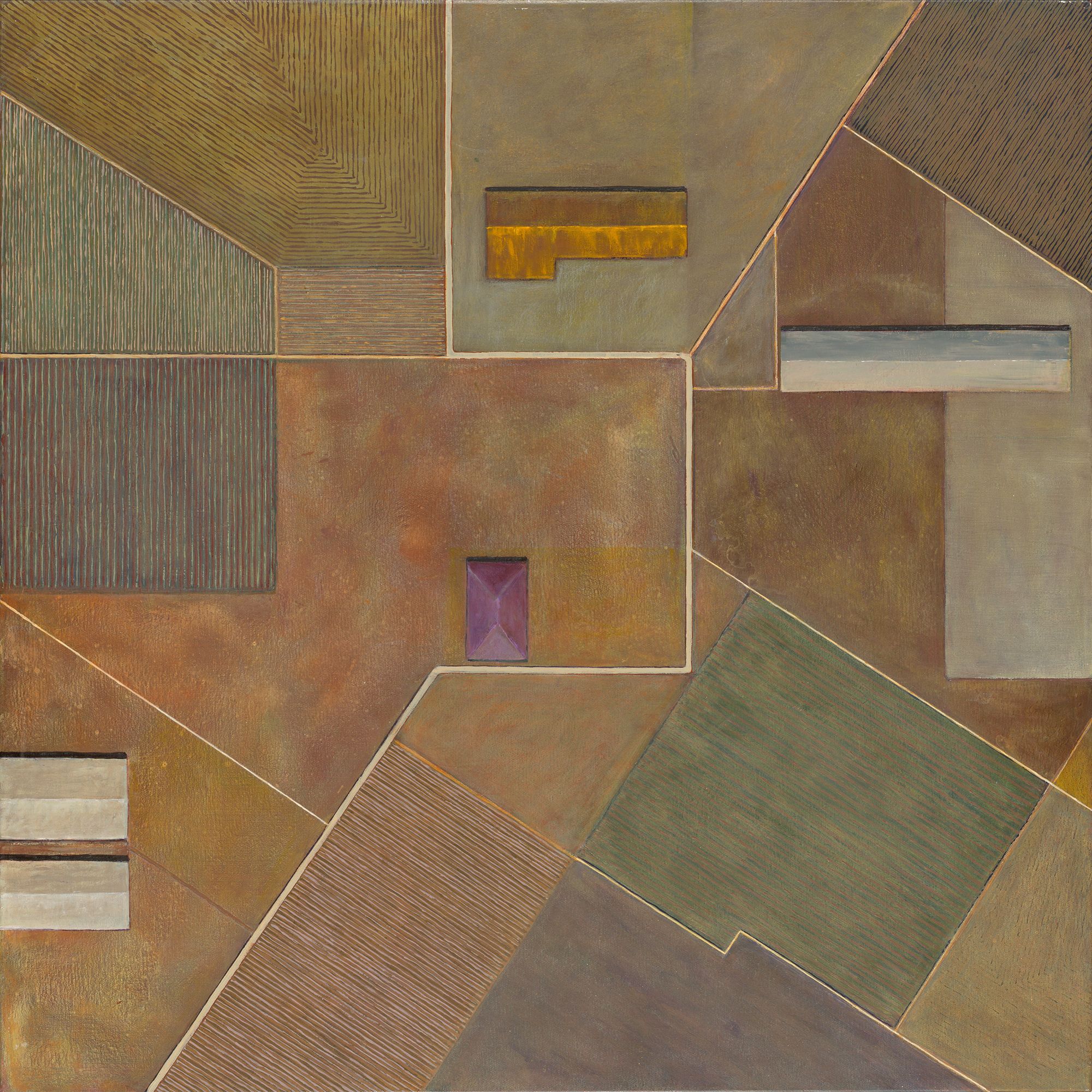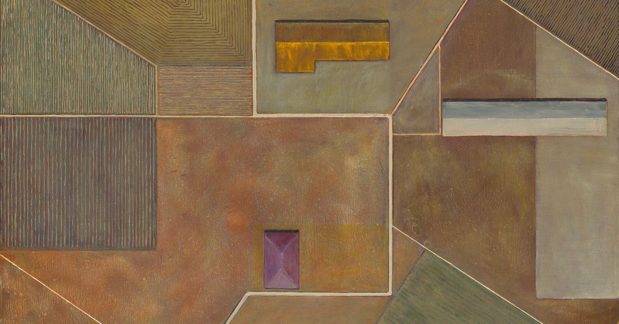 Brigid Cole-Adams (30 December 1938–2015) began her artistic career in Brisbane where she attended Jon Molvig's drawing classes in the late 1950s. The last house 2011 (illustrated) is a fine example of her late paintings, this work is inspired by aerial photographs of barley fields in western New South Wales that were sown using Global Positioning Systems (GPS) technology. Using the satellite-based technology, the barley seeds were planted in over two-kilometre-long stretches.