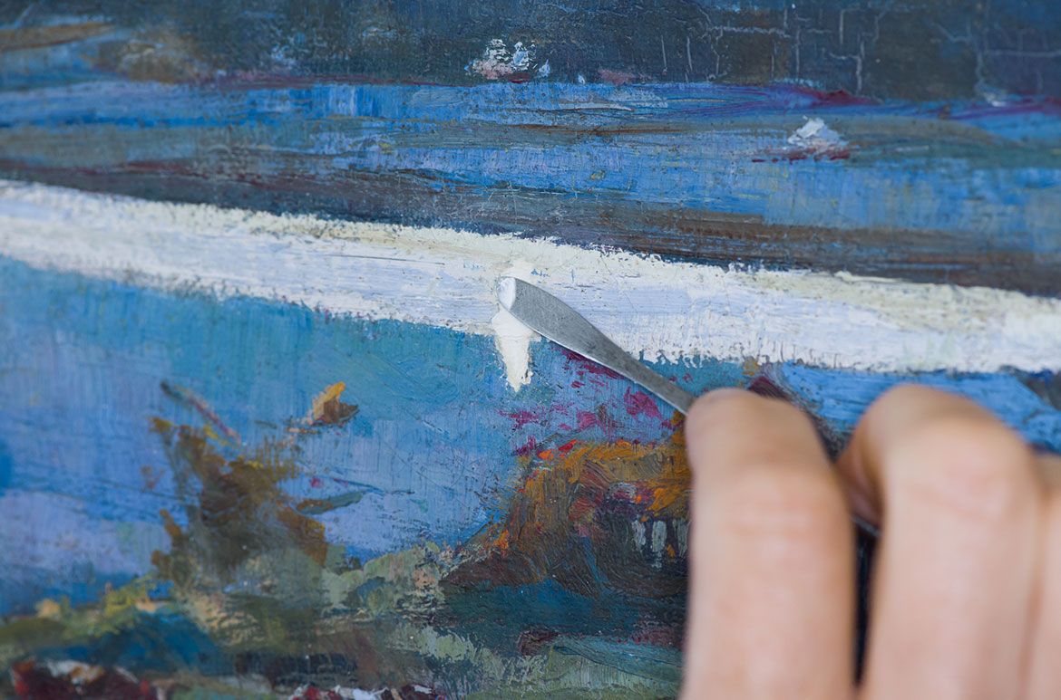 Watch as the artist’s original colours are restored in Anthony Alder’s Heron’s home 1895 showing the full tonal range and sharpness of image. The varnish layer is removed using cotton swabs and a carefully-tailored solvent blend, revealing the artist’s original colours, and restoring the full tonal range and sharpness of image.