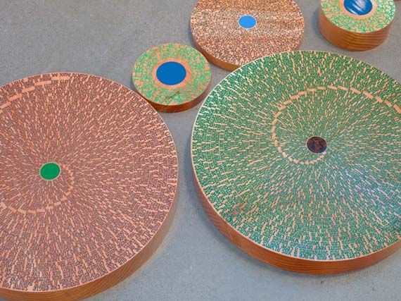 Floyd prints quotations from these texts onto blocks of reclaimed timber, which are then piled up over a sizeable area of the gallery floor, around a much larger wooden egg — the symbol of life and a source of food. She distinguishes the blocks by the use of different fonts. According to QAGOMA’s Julie Ewington in her Optimism catalogue entry on this work, ‘Heavy Heap’ marks the permaculture ones; while ‘Neuropol’ is used for the feminist science fiction.[1] ‘Heavy Heap’ is more rounded and incorporates countercultural swoops as serifs; ‘Neuropol’ is comparatively angular and sharp. They are actually not that different, which is surely part of the point: a viewer has to look and read closely.