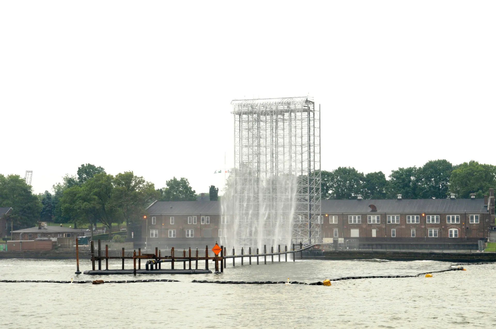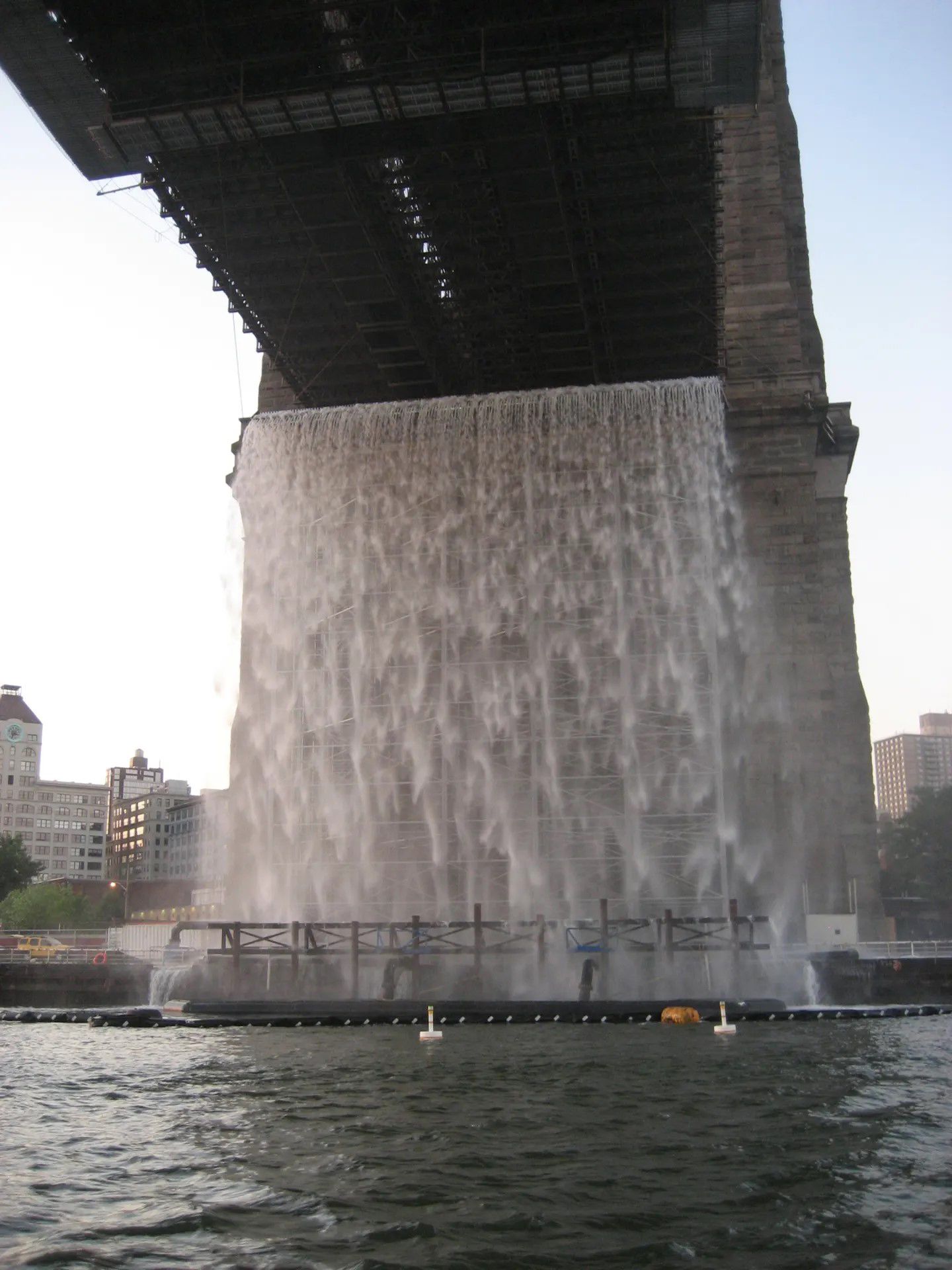 The New York City Waterfalls was an installation of four cascading waterfalls located in the East River, New York, merging art, engineering and nature aiming to make the public more aware of their relationship with the urban waterfront and the power of nature. The 30-40m high structures were on the Brooklyn anchorage under Brooklyn Bridge; between Piers 4 and 5 in Brooklyn; Lower Manhattan at Pier 35; and on Governors Island.