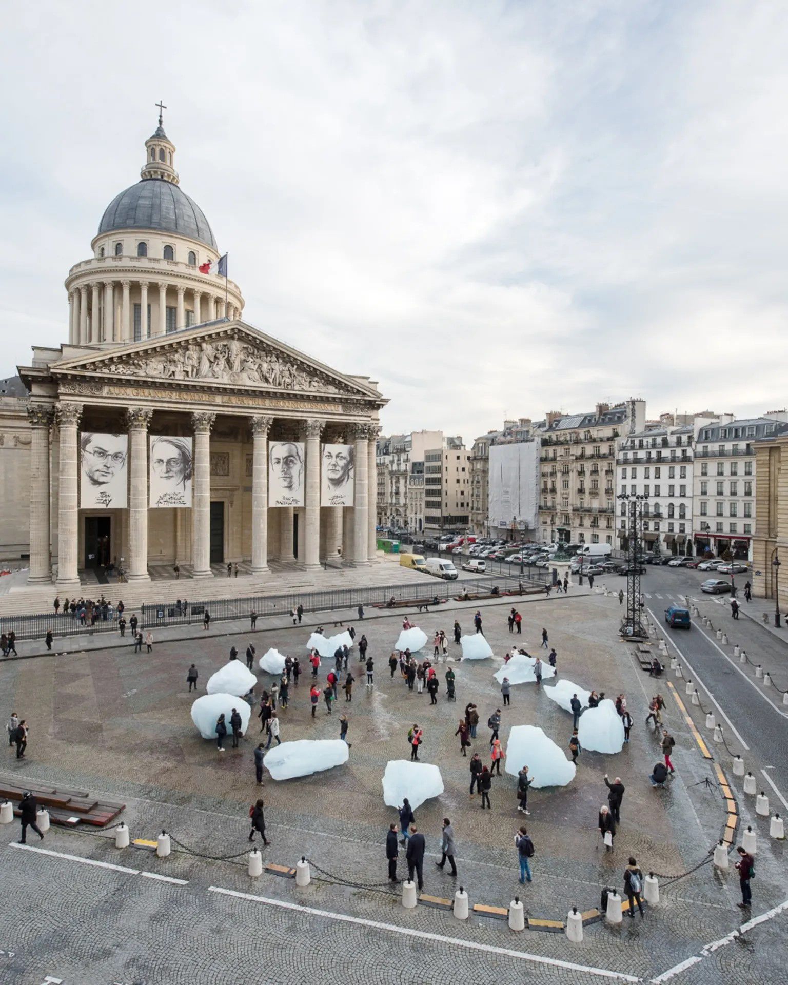 Twelve large blocks of ice cast off from the Greenland ice sheet were harvested from a fjord outside Nuuk and presented in a clock formation at Place du Panthéon, and in prominent public places around the world. Ice Watch 2014 raised awareness of climate change by providing a direct and tangible experience of the reality of melting arctic ice.