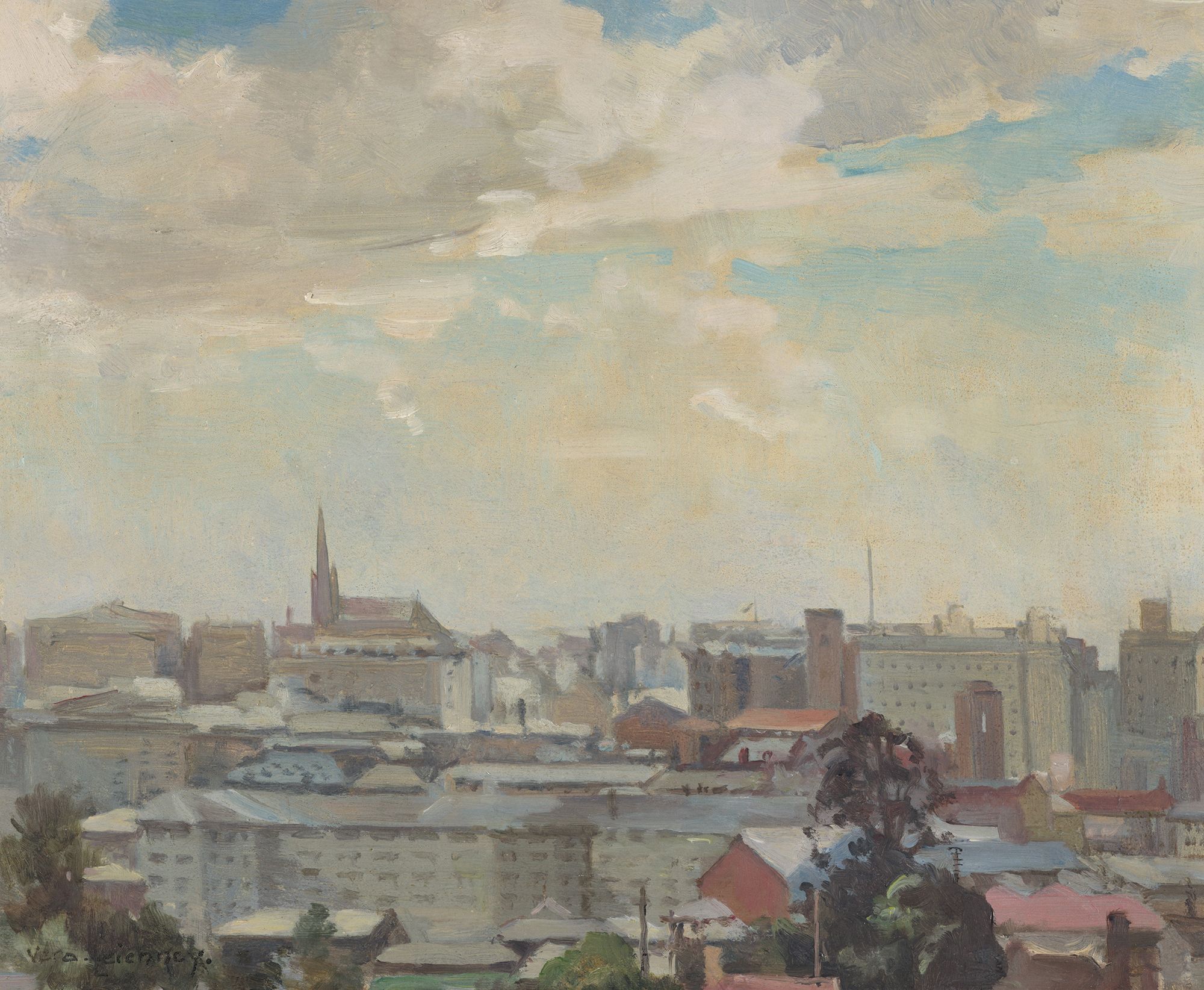 Viewed from across the Brisbane River at South Brisbane, Vera Leichney's (1886–1951) Brisbane skyline c.1944 is a modest and accomplished painting which focuses on a slice of Brisbane’s central business district and the buildings along William Street and Queen's Wharf Road that serviced the nearby wharves, an area integral to early settlement.
