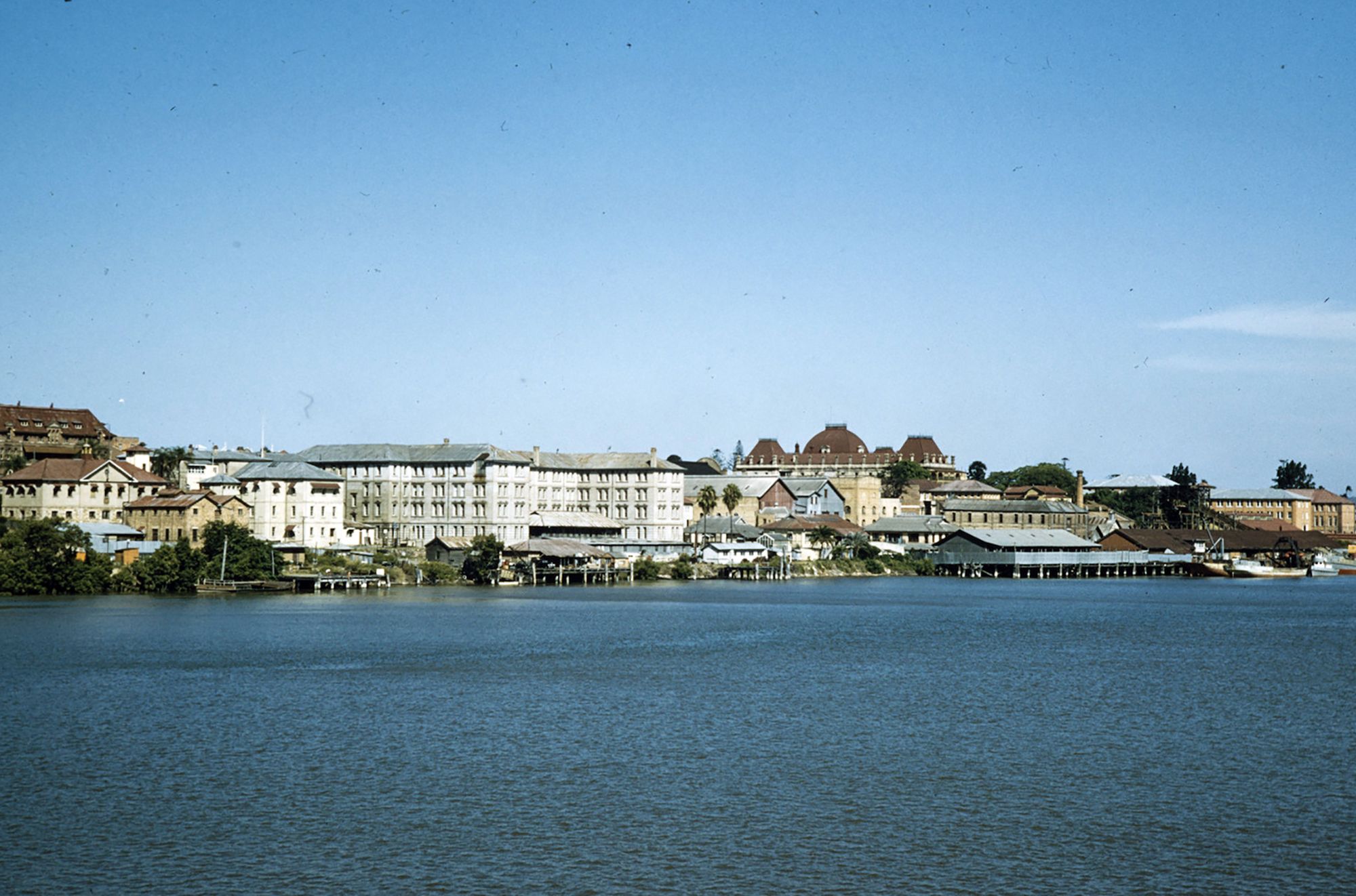 Buildings and wharves along William Street viewed from Victoria Bridge, 1958 / 99184072916802061 / Courtesy: John Oxley Library, State Library of Queensland, Brisbane / View full image
