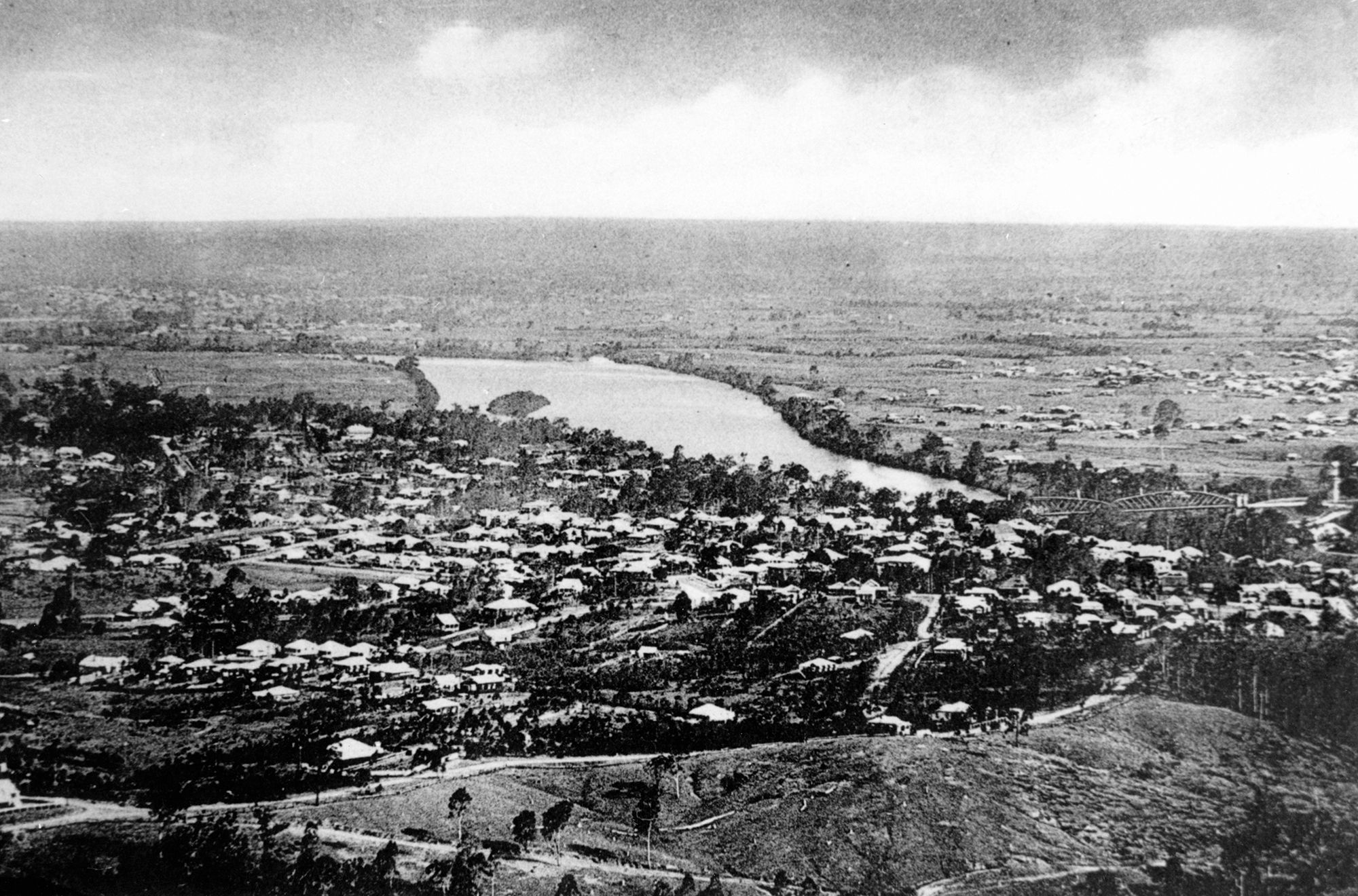 View of Indooroopilly toward Graceville from Mount Coot-tha, c.1930. The Indooroopilly railway bridge can be seen far left / 99183513246702061 / Courtesy: John Oxley Library, State Library of Queensland, Brisbane / View full image