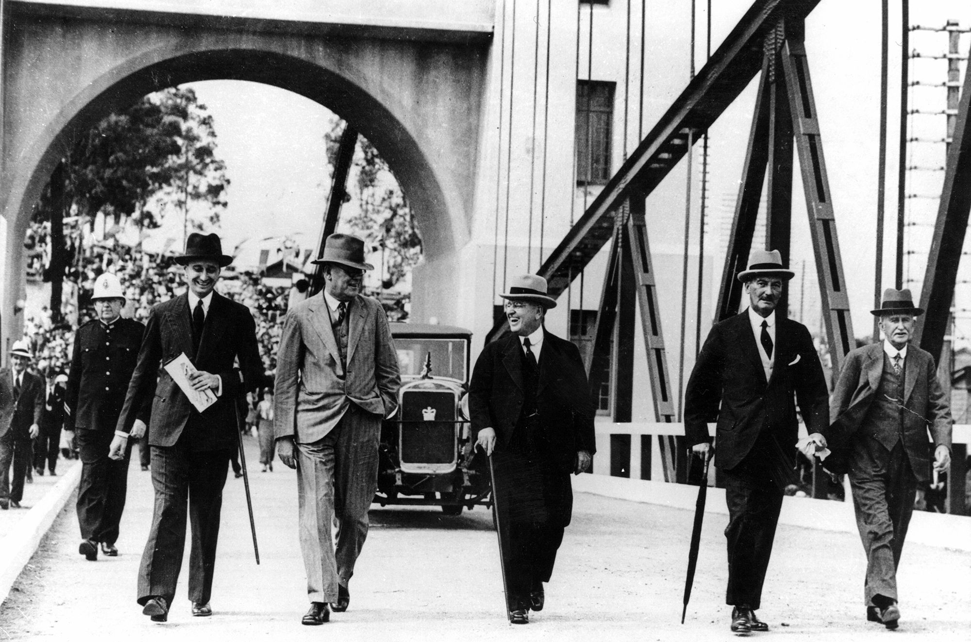 Official opening of the Indooroopilly Toll bridge (renamed Walter Taylor in 1956) with Governor of Queensland, Sir Leslie Orme Wilson, and the official party with Walter Taylor (far right), 1936 / 99183512923302061 / Courtesy: John Oxley Library, State Library of Queensland, Brisbane / View full image
