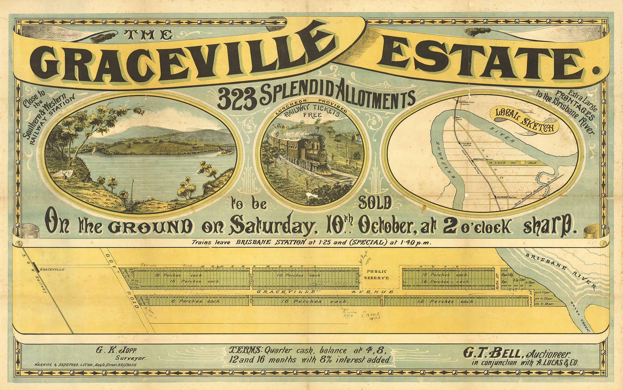 As Brisbane grew, demand for land in the outer areas increased, leading to the development of Indooroopilly and Graceville as residential suburbs. Graceville, also located some 10 kilometres south-west of the Brisbane CBD on the opposite side of the river to Indooroopilly, originally used for sheep and cattle grazing until the mid nineteenth century, developed into a semi-rural settlement, however with the arrival of rail saw development from the 1880s, facilitating the growth of the area with acreage subdivided into smaller farms, then into a residential plots.