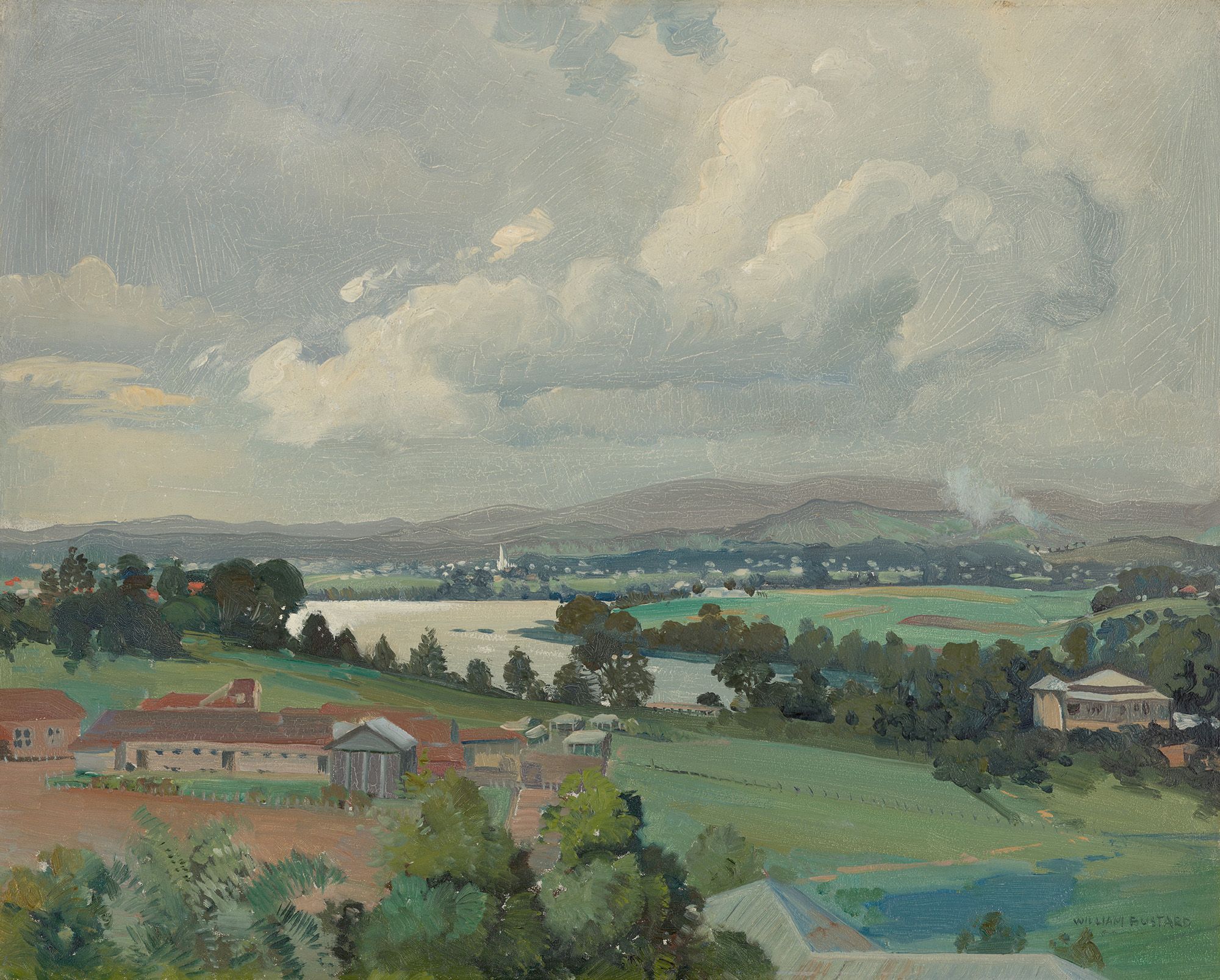 William Bustard, England/Australia 1894–1973 / (Brisbane River, view to Graceville church) c.1940s / Oil on board / 39 x 49cm / Purchased 2005 / Collection: Queensland Art Gallery | Gallery of Modern Art / © William Bustard Estate / View full image