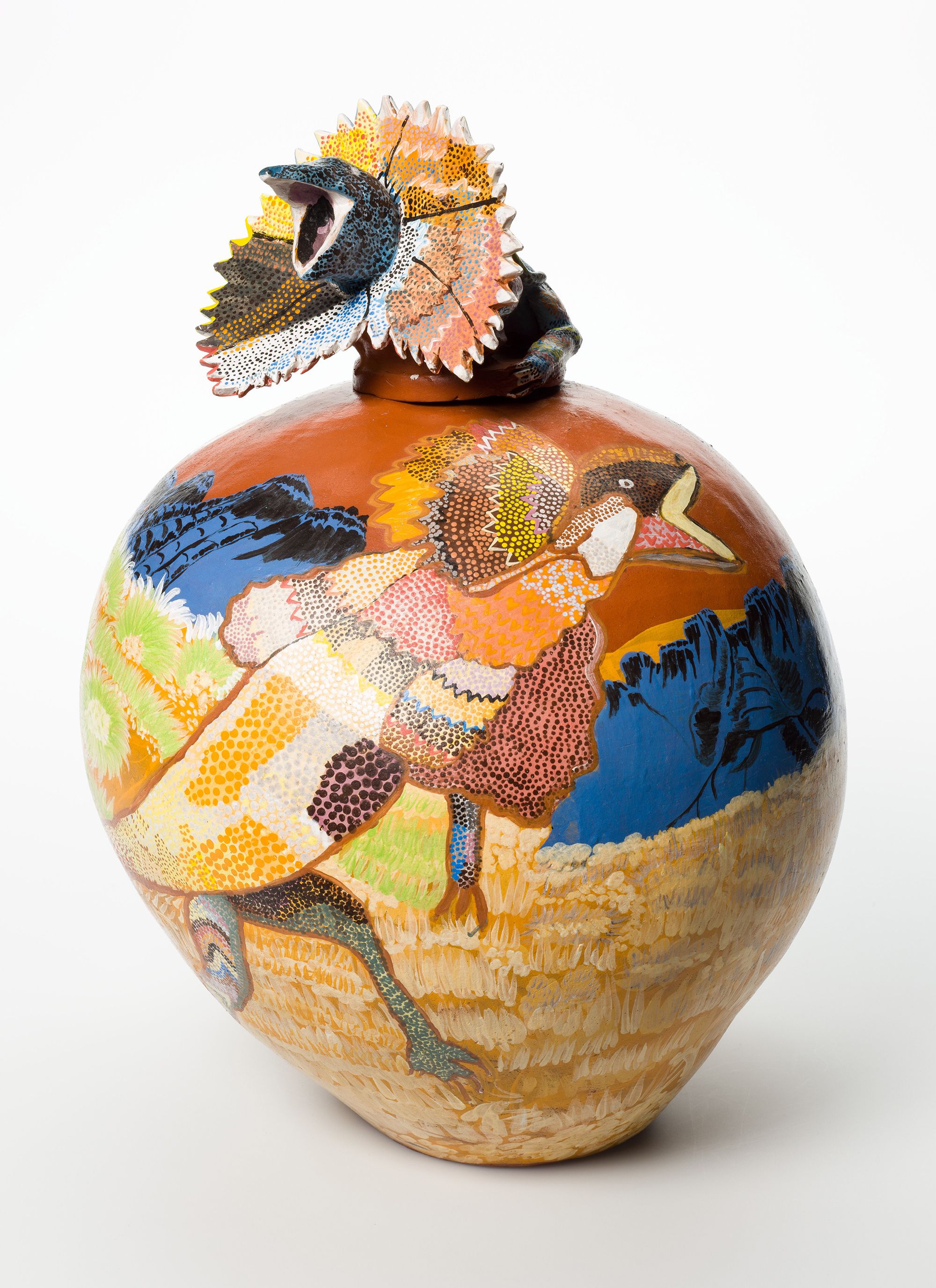 Hermannsburg Potters, Northern Territory, Australia est. 1990 / Rahel Ungwanaka, Arrernte/Luritja people, Australia b.1946 / Ankarta (Frill-necked lizard) 2005 / Earthenware, hand-built terracotta clay with underglaze colours and applied decoration / 39 x 26cm (diam.) (complete);pot: 28 x 26cm (diam.);lid: 12 x 17.5 x 13cm / Purchased 2006. QAG Foundation / Collection: Queensland Art Gallery | Gallery of Modern Art / © Rahel Ungwanaka / View full image