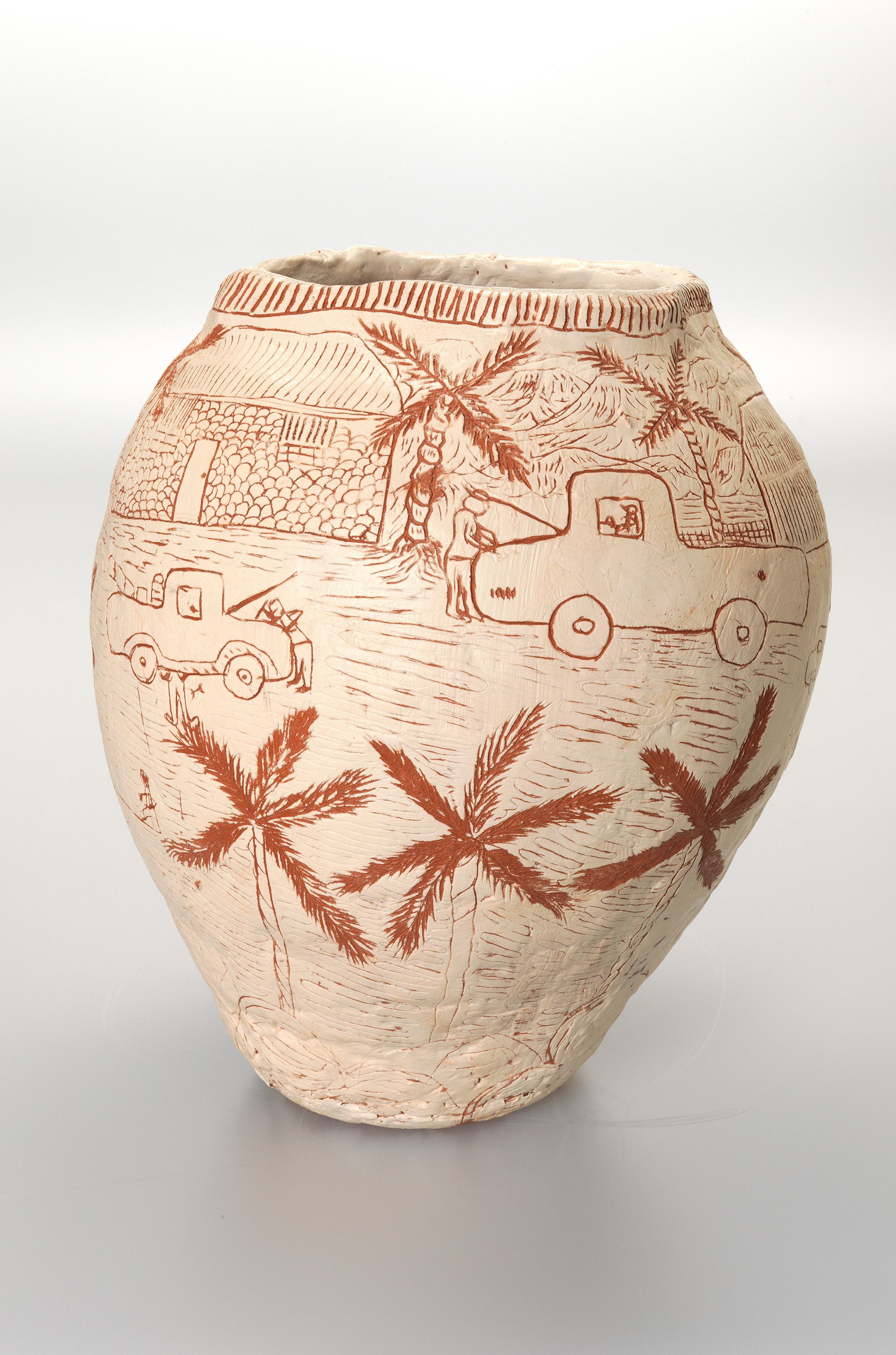 Sgraffito is a recent addition to the repertoire of the Hermannsburg Potters and has been adapted to much success. Incisions into the white slip contrast against the terracotta base to create a strong visual effect through which the artists convey their story. Clara Inkamala shows the old Ntaria (Hermannsburg) garage, where her uncle worked, the scene is completed by the white stone-built buildings and date palms which make up the old mission headquarters, now known as the Hermannsburg Historical Precinct.