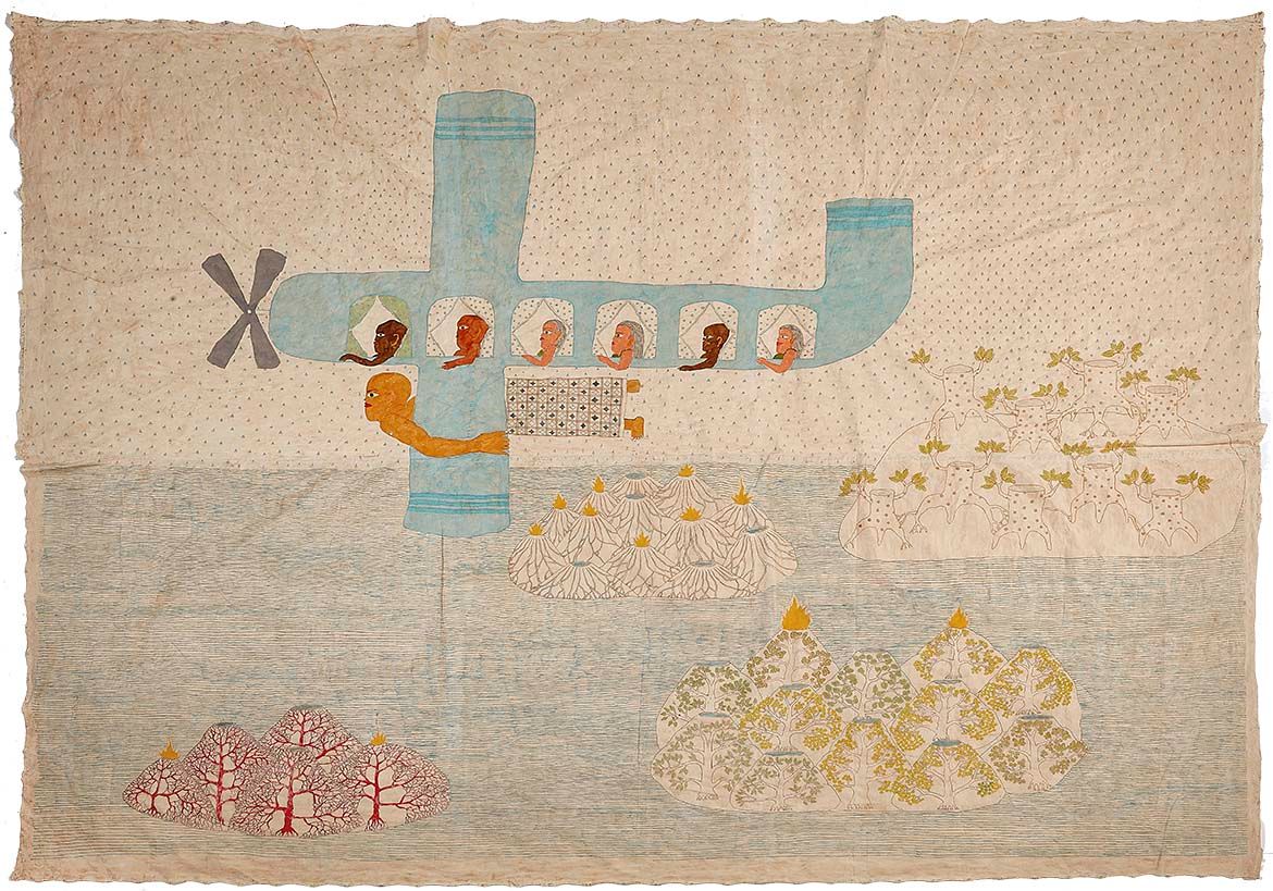Across these banner-size cloths Jumaadi’s characters relay their magical tales in theatrical compositions. A boat transporting dust (perahu bermuatan debu) 2021 is inspired by stories of migration, including the biblical tale of Noah’s Ark and current day refugee ships passing through the Indonesian archipelago seeking refuge in Australia and elsewhere. In the work, a boat is loaded with sleeping people, animals, people wearing duck masks, people carrying burdens, a dead body, a large-scale head and people sitting, adopting postures resembling statues from eastern Indonesia. Flying artist (illustrated) 2021 explores the subjects of transportation, migration and dreams. Mimicking Leonardo da Vinci’s flying machine, the artist has tied his body to a plane. Together they fly across the seas, seeing islands float beneath them like clouds. Here the flying artist is the hero but is depicted in a lonely state, wearing only his sarong from his old village. Mountain high (peziara peziara) 2021 (illustrated) depicts ant-like pilgrims on a tall mountain, representing people who climb the tombs of the kings of Imogiri. Both those going up and those going down the mountain seem to carry burdens and use different means and methods as well as rituals to reach the top of the tomb. Slingshot (the tree of life is the tree of death) 2021 is inspired by the game of Russian roulette; it explores the tension between two human beings, a man and woman, tied together in a slingshot. They face each other, sitting on the roof of a house, and above their heads are the tree of life and the tree of death inspired by an image from a handwoven ikat cloth from Sumba.[4]
