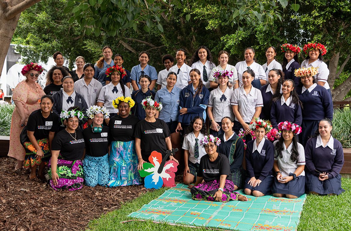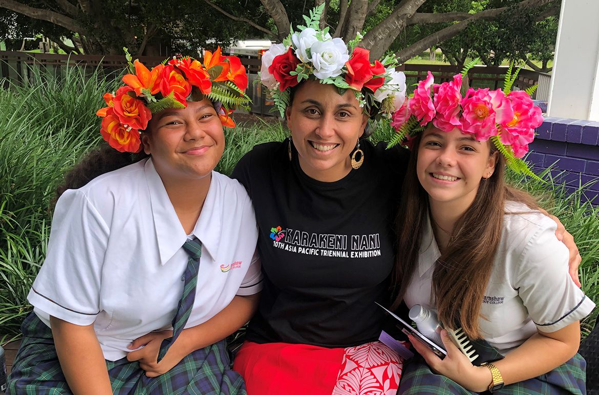 35 female Pasifika students from Bellbird Park State Secondary College, Earnshaw State College and Mabel Park State High School were invited to take part in a full-day program at GOMA. Together with PWA and Ruth McDougall, Curator, Pacific Art, we explored works by Pasifika artists in ‘APT10’ including the Seleka International Art Society Initiative, ‘Air Canoe’ and ‘Uramat Mugas’, before taking part in two workshops facilitated by PWA: mwar mwar (flower crown) weaving with Inca Chow and tok stori (spoken word) with Vanessa Gordon.