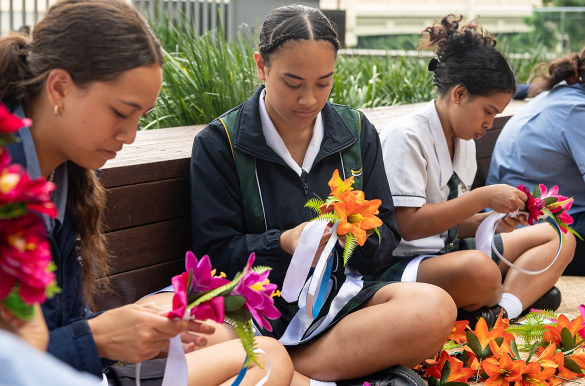 Students learn to make mwar mwars (flower crowns) as part of ‘Karakeni Nani: Women’s Wealth Workshop’, March 2022 / Photograph: C. Callistemon © QAGOMA / View full image
