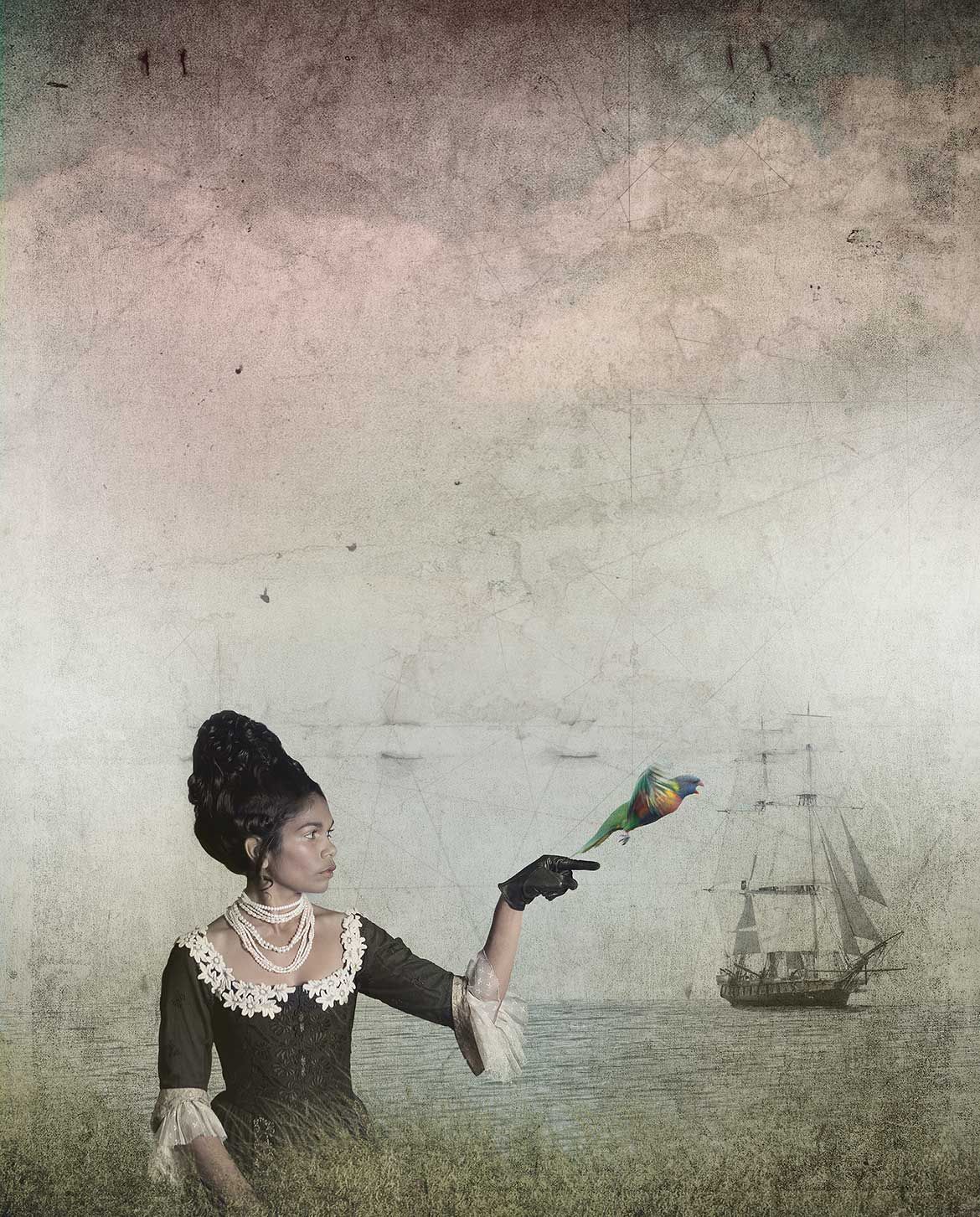 Throughout the series, the woman is accompanied by a single rainbow lorikeet. Its presence is slightly unnerving, its role never entirely clear; like the wild lorikeet, its intentions are hard to read. Cook’s dream-journey explores the tension between the freedom of the colourful bird and the muted dresses and dreams of its female human counterpart. The lorikeet gradually reveals itself as the embodiment of the woman’s spirit, a symbol of the freedom for which she yearns but can never grasp — this new colonial life is being built for her by powers half a world away. ‘Dreams broken, hopes replaced with despair, she begins to shed her newly-clothed skin and returns to her roots to find freedom — the connection back to her land.’[2]