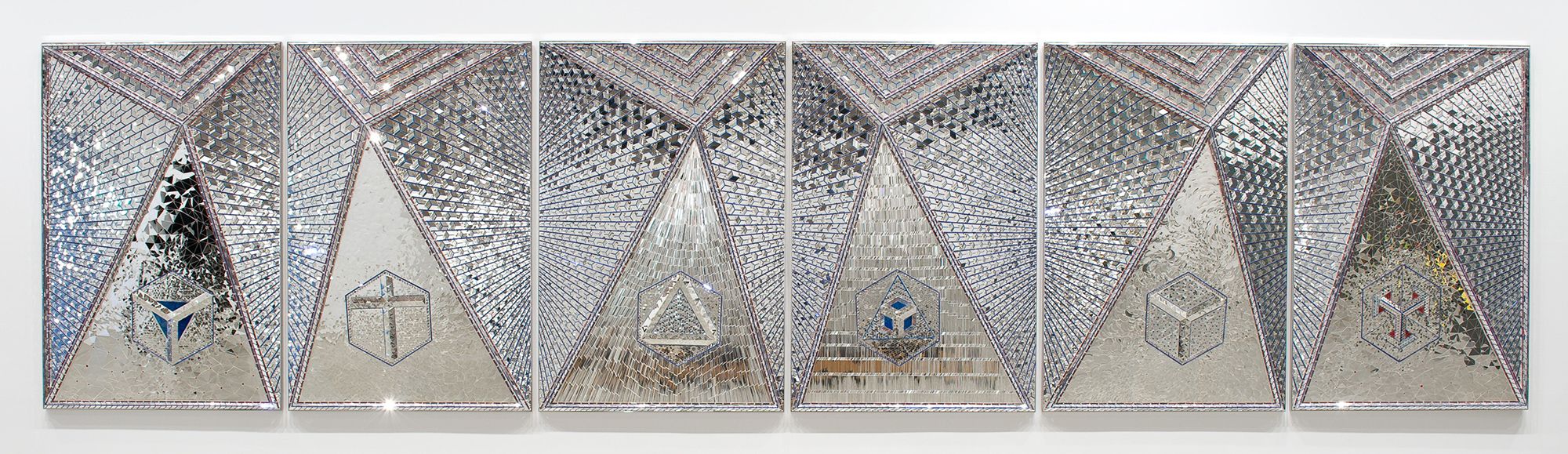 Monir Shahroudy Farmanfarmaian, Iran 1924-2019 / Lightning for Neda 2009 / Mirror mosaic, reverse-glass painting, plaster on wood / Six panels: 300 x 200 x 25cm (each); 300 x 1200 x 25cm (overall) / The artist dedicates this work to the loving memory of her late husband Dr Abolbashar Farmanfarmaian. Purchased 2009. QAG Foundation / Collection: Queensland Art Gallery | Gallery of Modern Art / © Monir Shahroudy Farmanfarmaian Estate / View full image
