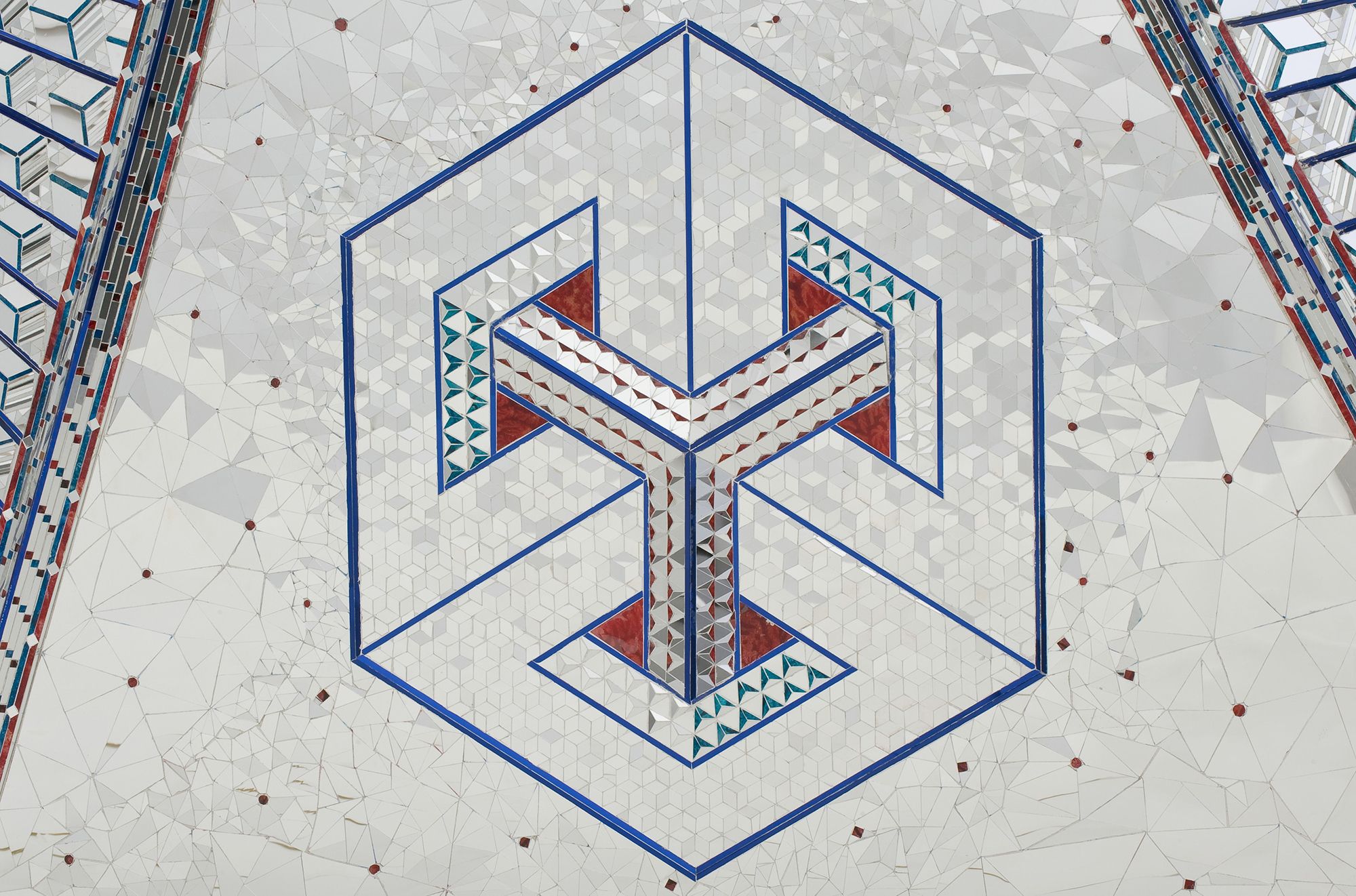 The work’s six panels of intricate mirror mosaic explore the geometric possibilities offered by the hexagon. Essentially abstract, Lightning for Neda draws on the Islamic use of geometry to structure and develop complex architectural ornamentation, the six sides of the hexagon provide an underlying structure, and are expanded and elaborated upon as a repeated motif. The hexagon represents the six directions of motion (up, down, front, back, right, left) and the six virtues of generosity, self-discipline, patience, determination, insight and compassion.