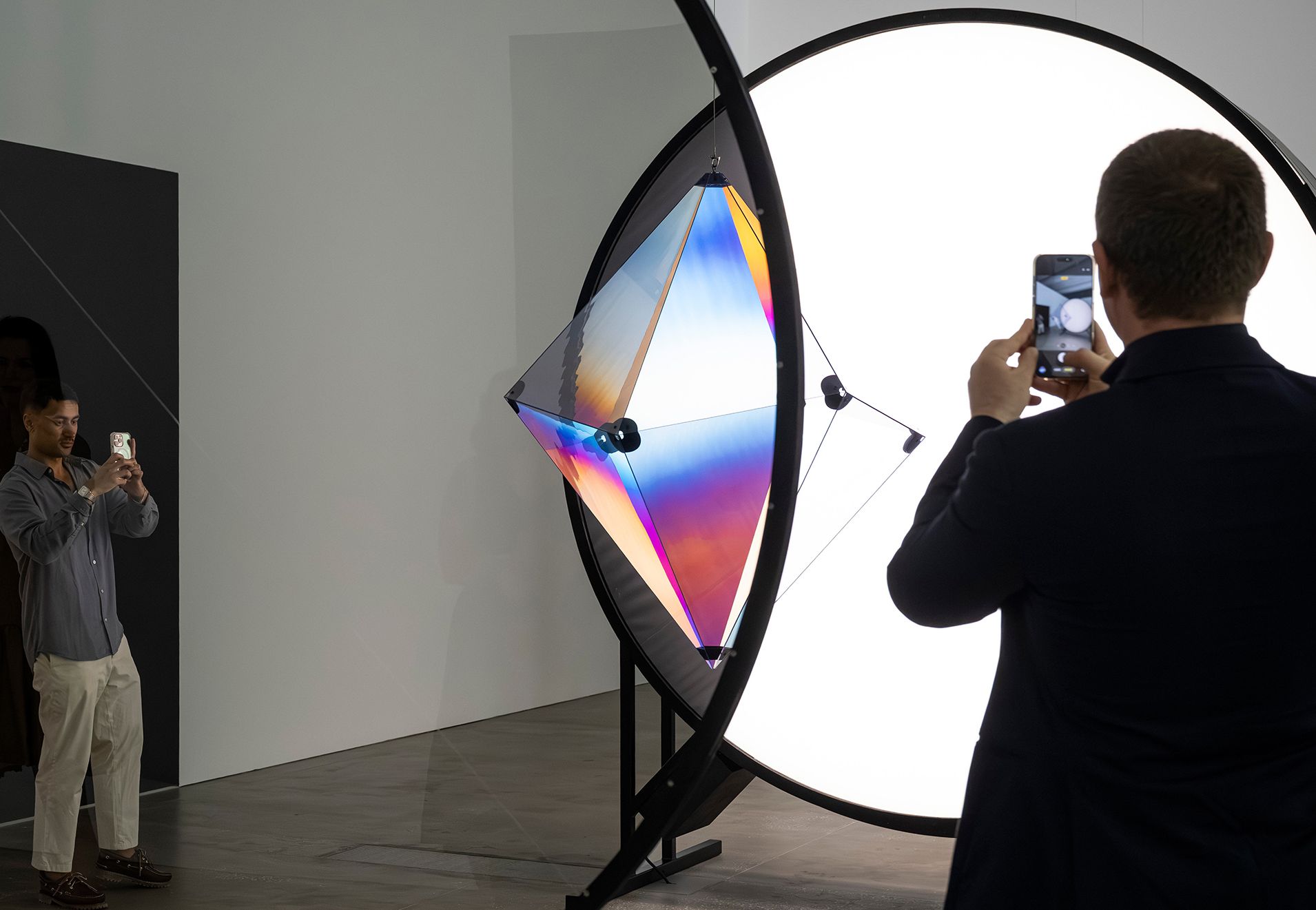 The ‘two perspectives’ referred to in the work’s title are set up around a central, circular lightbox that projects light in two directions. Transparent plastic elements are suspended on either side of the lightbox and a circular polarising filter acts as a viewfinder through which the visual phenomenon can be observed. A single polyhedron — a hexagonal bipyramid — rotates on one side, while on the other, two discs revolve about their axes, sometimes aligning with one another and sometimes overlapping. As the elements move, the relationship between the two materials shifts constantly, causing the shimmering colours to change. In addition to these elements in motion, viewers’ own movements and changing perspectives add further diversity to the artwork experience.