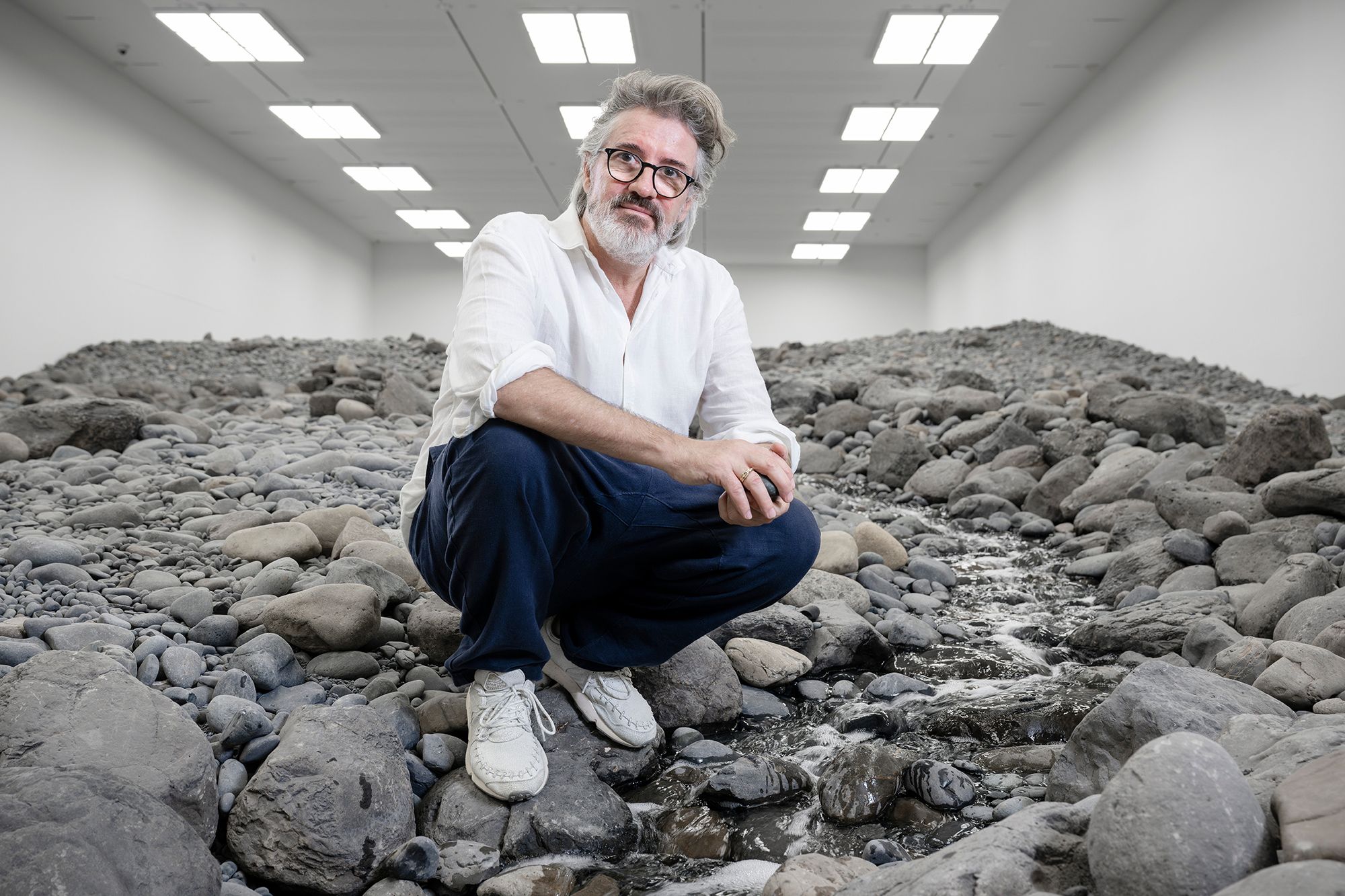 Olafur Eliasson, Denmark b.1967 / Riverbed 2014 (installation view, GOMA, 2019) / Water, rock (volcanic stones [blue basalt, basalt, lava], other stones, gravel, sand), wood, steel, plastic sheeting, hose, pumps / Purchased 2021. The Josephine Ulrick and Win Schubert Charitable Trust. Collection: The Josephine Ulrick and Win Schubert Charitable Trust, QAGOMA / Collection: Queensland Art Gallery | Gallery of Modern Art / © 2014 Olafur Eliasson / Photograph: N Harth © QAGOMA / View full image