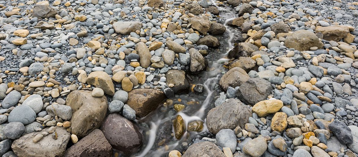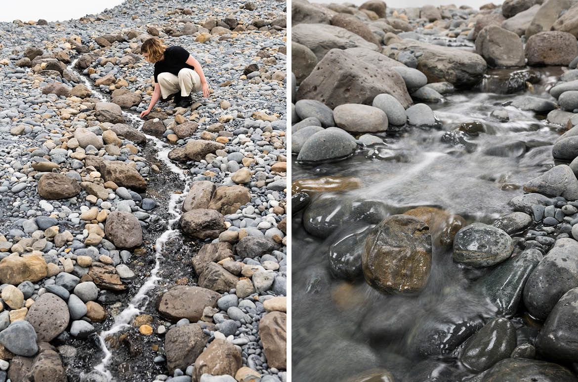 Riverbed is an expansive indoor installation of rock, sand, pebbles and water that evokes the wide, rocky rivers and formidable landscape of Iceland, yet might be many other places; or perhaps the bed of a once-mighty river now reduced to a small stream.