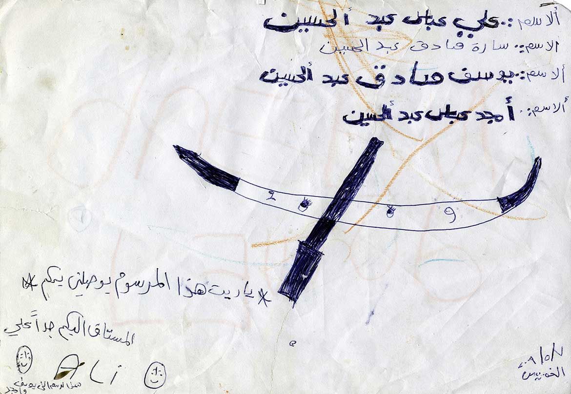 For Alfraji, this was no ordinary letter; it delivered a clear image of Ali’s dream ‘to be carried over the clouds, to new places and adventures where he can play and run freely, chasing his own golden wishes’.[1] It also resonated with Alfraji on a deeper level — he recognised the boat as though it was drawn from his own dreams. As a young man, he dreamed of a boat that he could take to flee the suffering of his country; as an adult he dreams of a boat that can carry him back to the Iraq of his childhood.