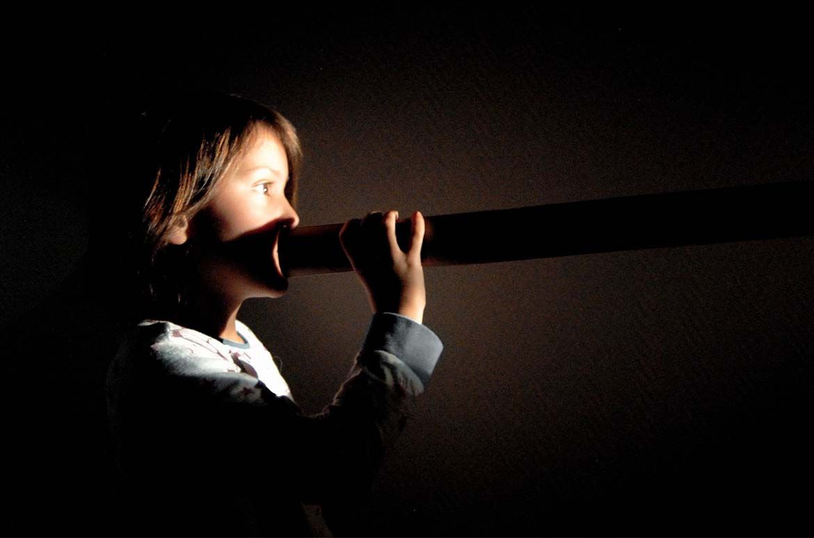The experience is indeed very intimate, even though the children are not close. Each child whispers through a rudimentary ‘speaking tube’ (or ‘listening funnel’) to two audience members sat in the row in front of them. As an audience member you hold a cone to your ear, a little like an old-fashioned telephone receiver. With the other ear you hear the soundtrack of the movie, which subtly influences your imagination as to what might be happened on the screen.