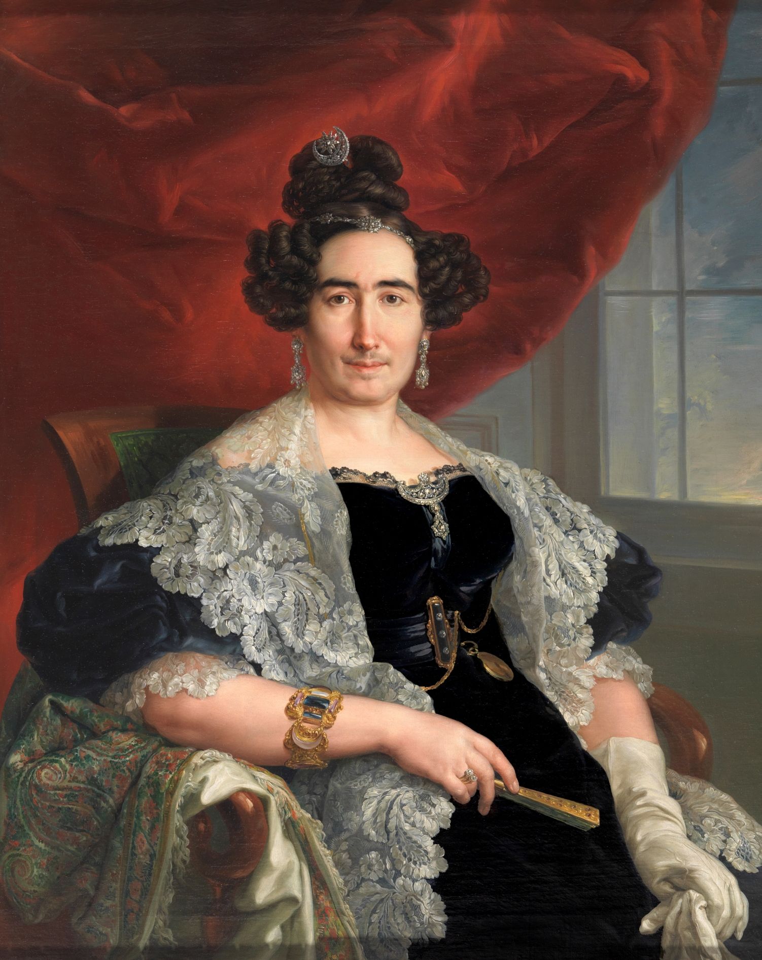 ‘The lady depicted here, around 50 years of age, is represented slightly greater than half-length, seated on a chair upholstered in green cloth, with a striking cashmere shawl of vivid colours lying on one of its arms. She is wearing a dark blue velvet dress with a lace mantilla covering her shoulders. Richly bejewelled, she wears a magnificent bracelet and a ring on her right hand, in which she is also holding a fan, while her gloved left hand rests on her lap. She wears her hair done up in the fashionable style called tres potencias (literally, ‘three powers’), with tight curls on the sides and a large topknot held in place with a magnificent pin shaped like a crescent moon and star, studded with diamonds, matching the chain on her forehead, her earrings and brooch. From the belt of her dress hangs the chain of a gold watch.’[1]