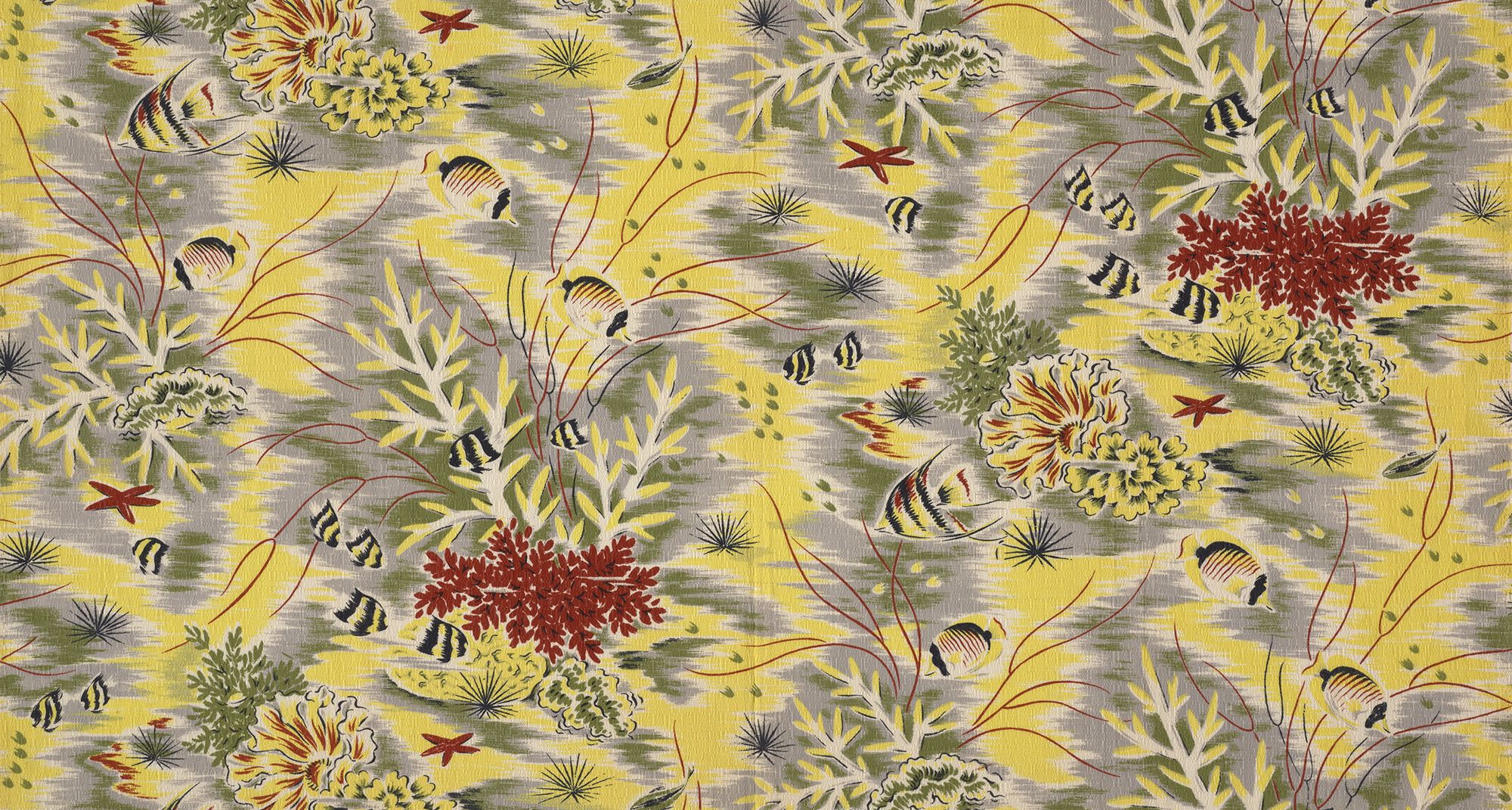 Olive Ashworth, Australia 1915–2000 / Textile length: Great Barrier Reef c.1970s / Commercial screenprint on cotton sateen / 126 x 112cm / Gift of Dr Judith McKay through the QAGOMA Foundation 2020 / Collection: Queensland Art Gallery | Gallery of Modern Art / © Olive Ashworth Estate / View full image