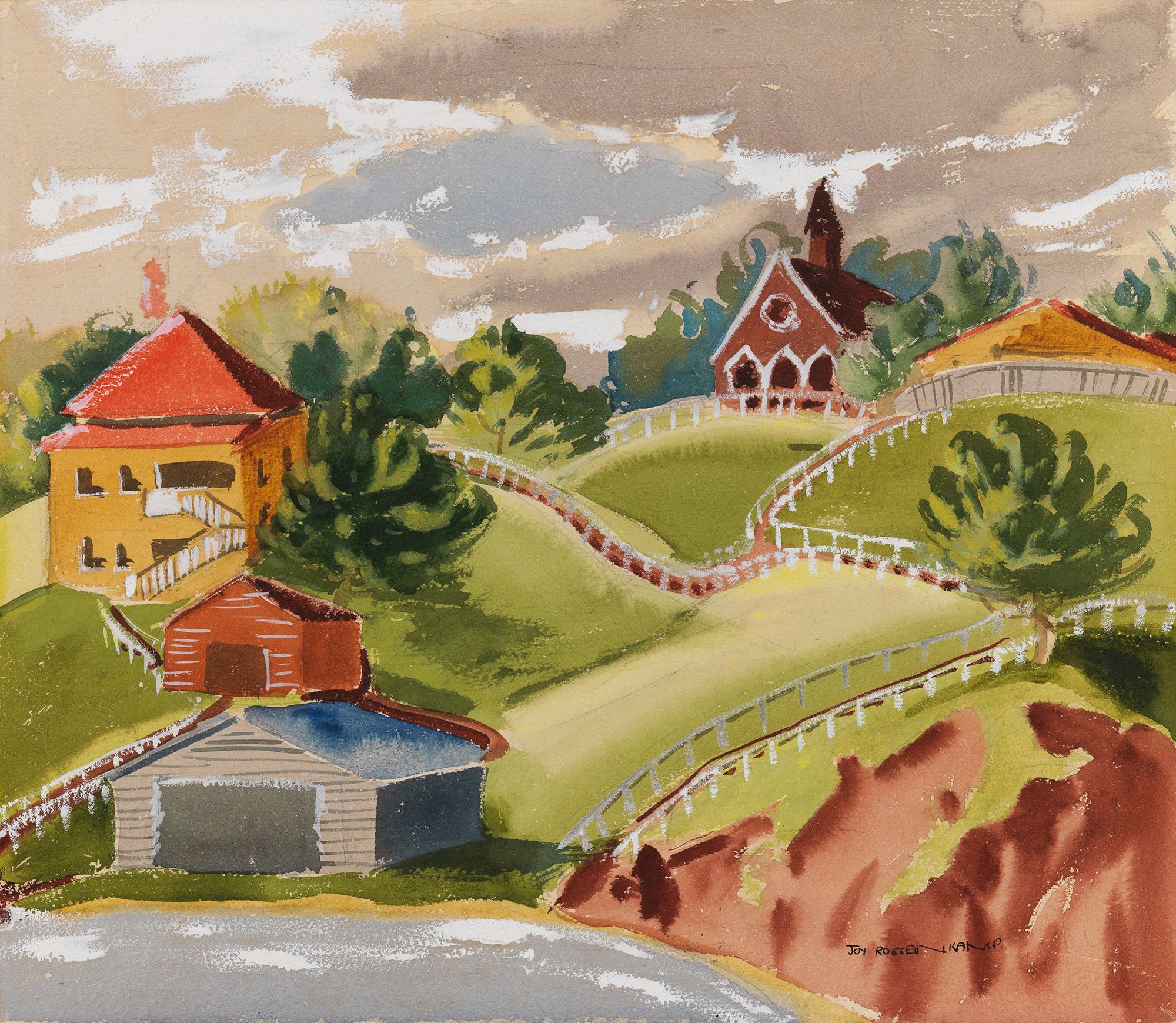 Joy Roggenkamp, Australia 1928–99 / Church at Sandgate c.1949 / Watercolour and gouache on buff wove paper / 33 x 38cm / Gift of Ross McCowan in memory of his wife Joy Roggenkamp through the QAGOMA Foundation 2013. Donated through the Australian Government's Cultural Gifts Program / Collection: Queensland Art Gallery | Gallery of Modern Art / © Joy Roggenkamp Estate / View full image