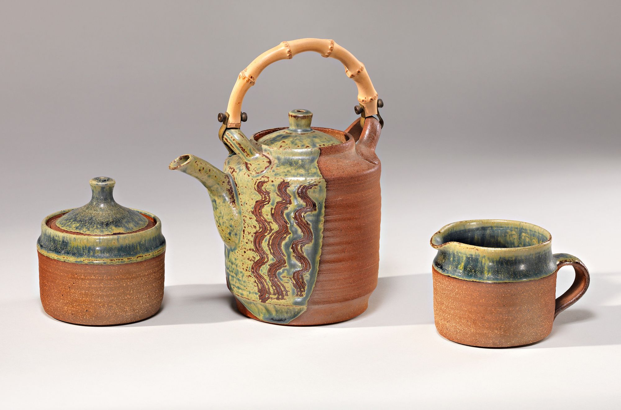 Carl McConnell, Australia 1926–2003 / Tea-set (teapot, sugar bowl and milk jug) c.1958 / Stoneware, thrown cylindrical brown body with partial blue green glaze and combed zig-zag decoration on the teapot. Cane handle / 14.5 x 14 x 10.5cm (complete) / Gift of Carl and Bunny McConnell 1987 / Collection: Queensland Art Gallery | Gallery of Modern Art / © QAGOMA / View full image