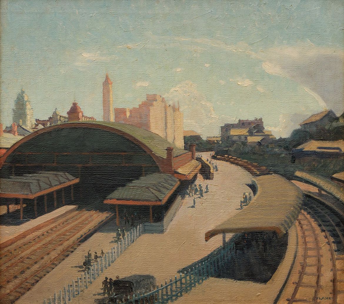 Vida Lahey, Australia 1882-1968 / Sultry noon [Central Station, Brisbane] 1931 / Oil on canvas on plywood / 44.7 x 49.2cm / Purchased 1983 / Collection: Queensland Art Gallery | Gallery of Modern Art / © QAGOMA / View full image