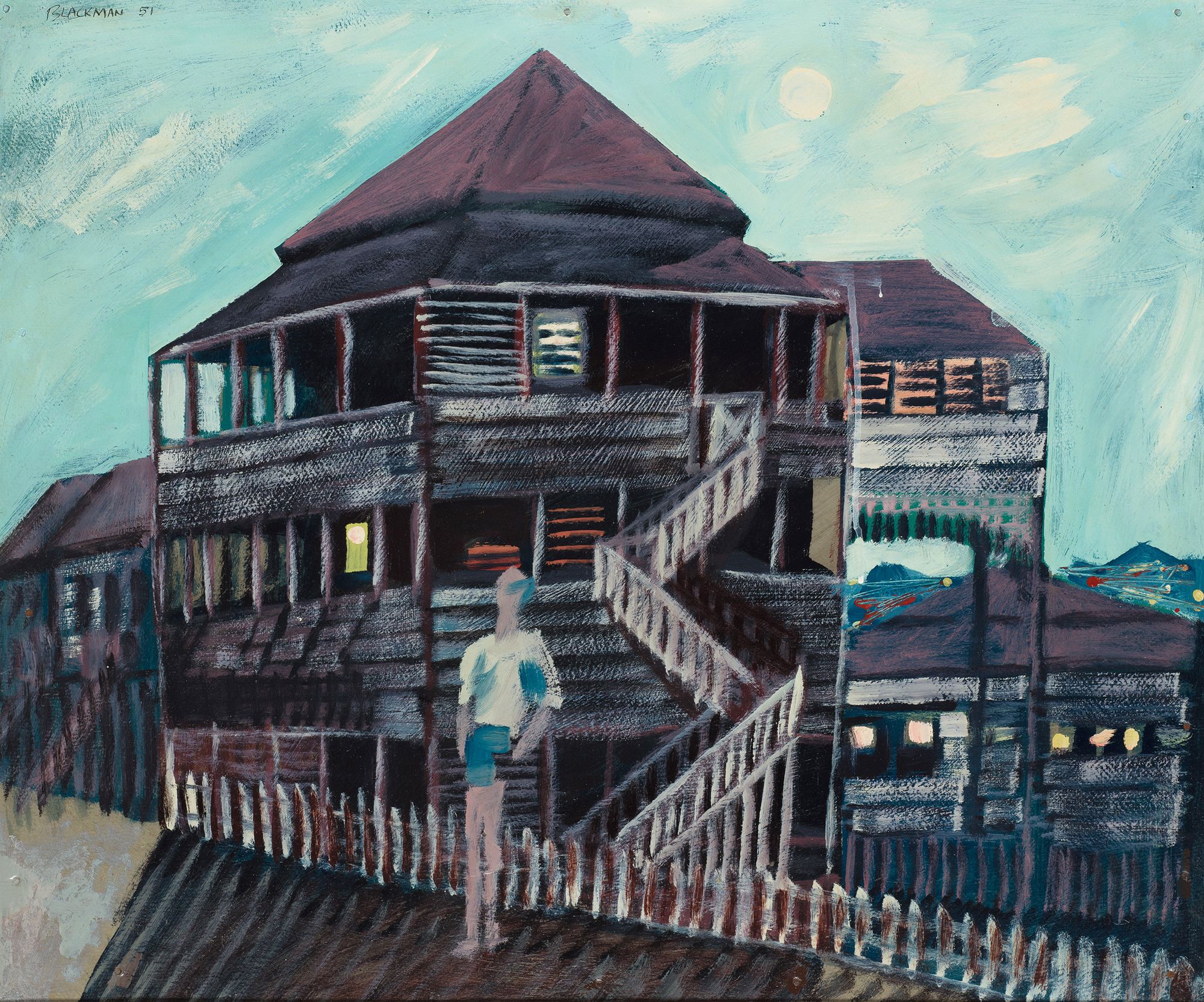 Charles Blackman, Australia 1928-2018 / (Self-portrait in front of a boarding house, Spring Hill) 1951 / Oil and enamel on cardboard / 63.5 x 75.5cm / Purchased 2011. QAG Foundation / Collection: Queensland Art Gallery | Gallery of Modern Art / © Charles Blackman/Copyright Agency / View full image