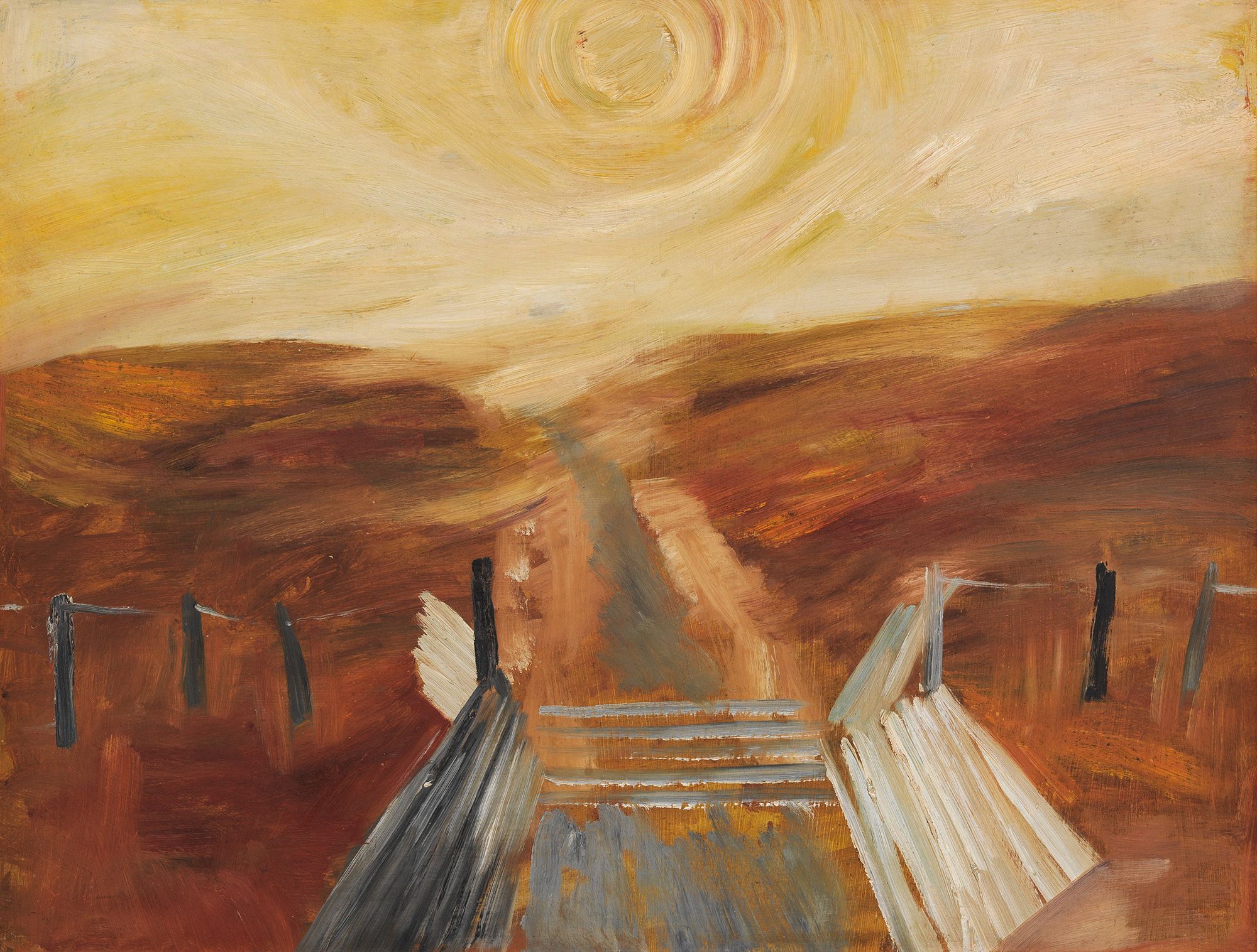 Jon Molvig, Australia 1923–70 / The cattle grid 1958 / Oil on composition board / 45.8 x 59cm / Bequest of Errol Blair de Normanville Joyce OBE 1983 / Collection: Queensland Art Gallery | Gallery of Modern Art / © Otte Bartzis / View full image
