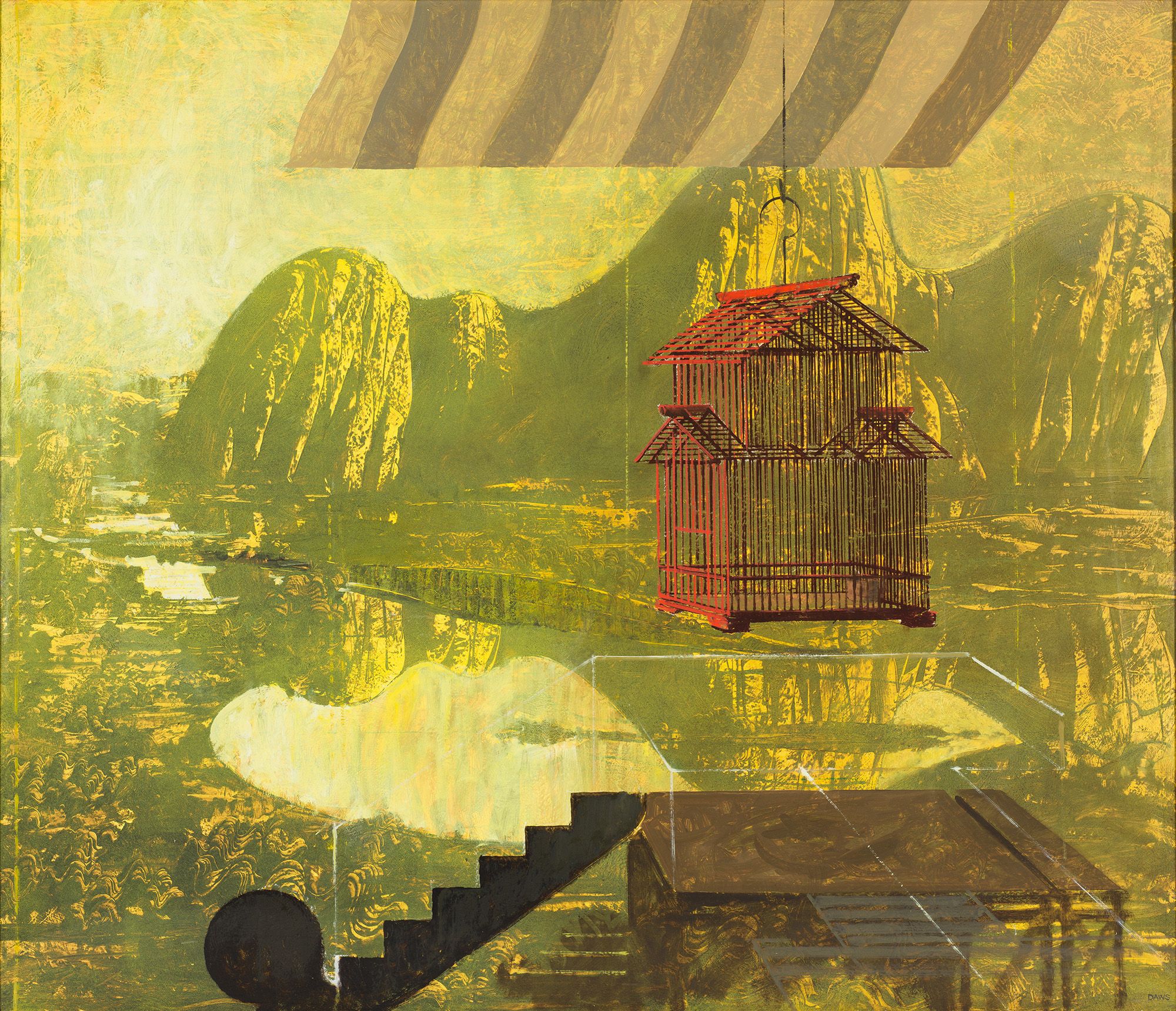 In 1970, Daws returned to Australia, living first on Bribie Island — where he befriended resident painter Ian Fairweather; then moving in 1974 to a property called ‘Owl Creek’, near the Glass House Mountains. The view of the mountains from his backyard fascinated him and he featured their monolithic forms in haunting paintings that brought him critical acclaim. Owl Creek III 1979–80 (illustrated) is one such example, purchased for the Collection in 1980: his depiction of the area’s undulating terrain exerts an eerie presence in the background, while a birdcage suspended from an awning suggests domesticity. By contrast, the inscrutable geometric forms in the foreground allude to a viewing platform — a device used by Chinese painters of the Song dynasty to serve as a visual departure point.